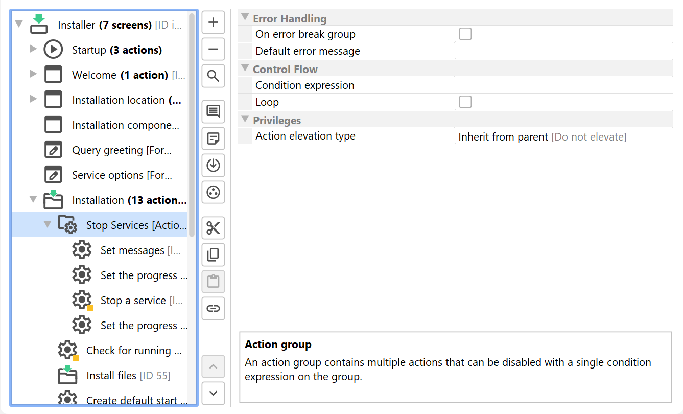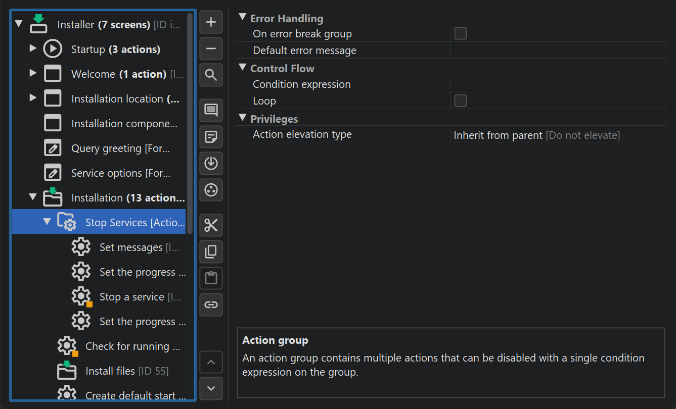Actions and screens can be grouped in the tree of installer elements. Groups of the same types can be nested, meaning that you can put a screen group into a screen group or an action group into an action group.