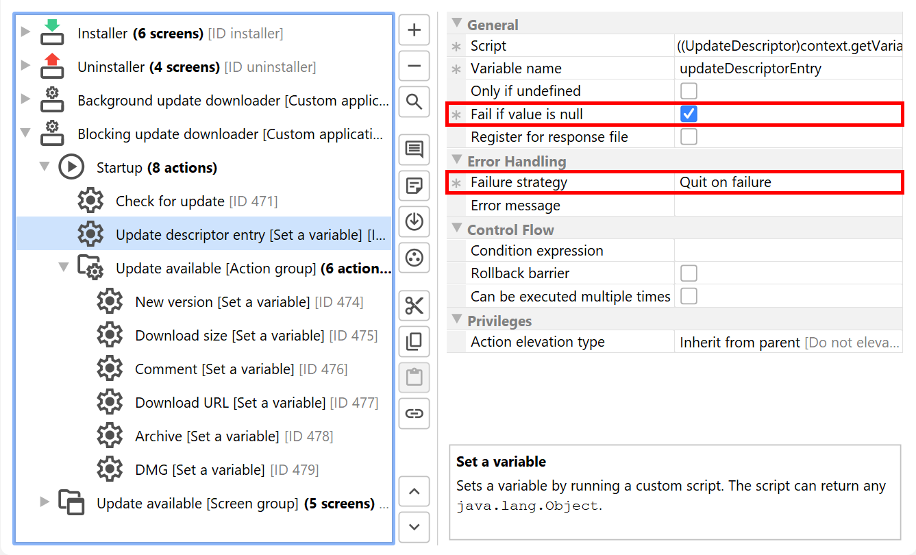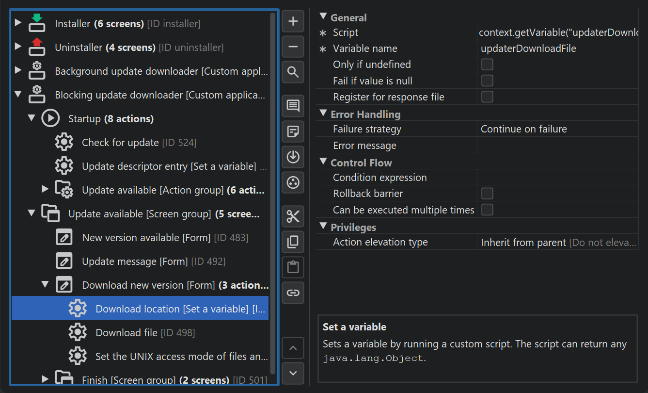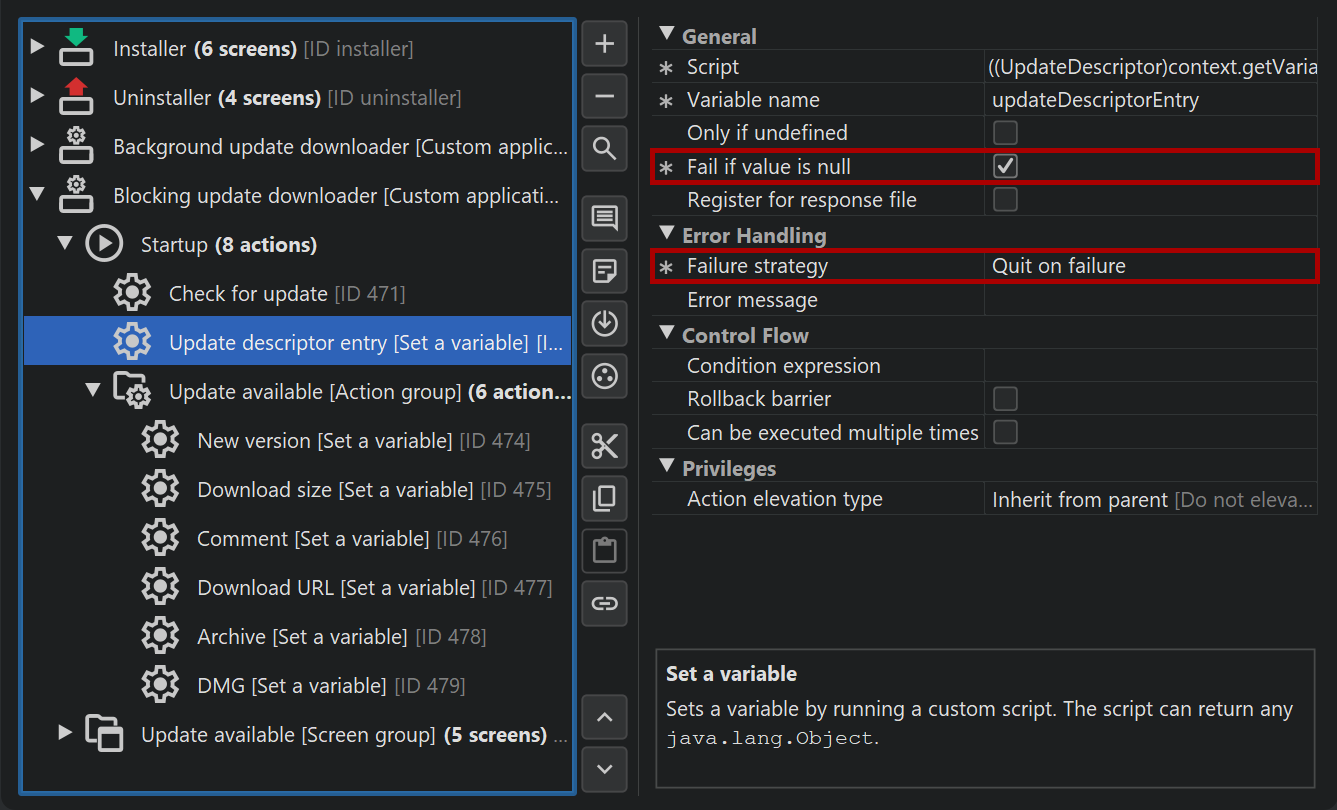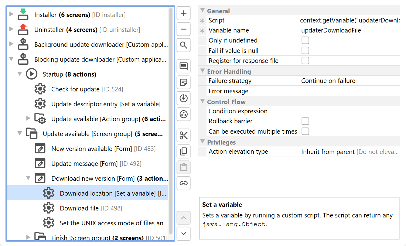 One exception is the single bundle archive for macOS where auto-updating is fully supported by the update downloader templates. On macOS, the single bundle archive is the preferred way to distribute software, unlike on other platforms that prefer installers or packages that are handled by a package manager. In the update downloader template you will notice screen and action groups that deal with the macOS single bundle archives separately.
