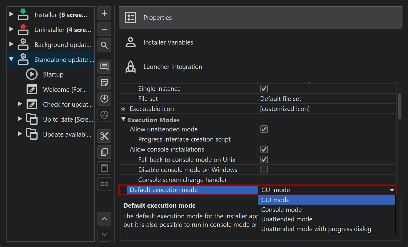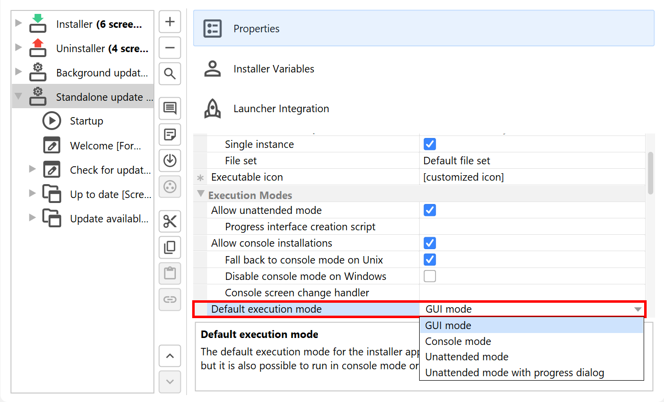 If a user interaction is not desired, the update downloader can work in unattended mode. The execution mode of the update downloader is set through its "Default execution mode" property. By default, it is set to "GUI mode". On Unix, access to the X-server is often not available, for example, when you install in an SSH session. Also by default, the "Fall back to console mode on Unix" property allows the installer to switch to console mode in that case.