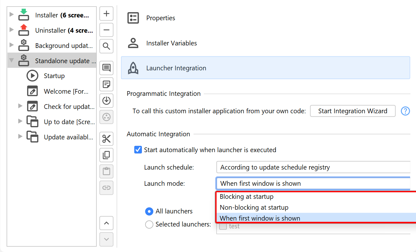 There are two points in the life-cycle of the launcher when the update downloader can be started: At startup or when the first window is shown. In addition, the invocation at startup can be blocking or non-blocking. This is set with the "Launch mode" drop-down on the "Launcher integration" tab.