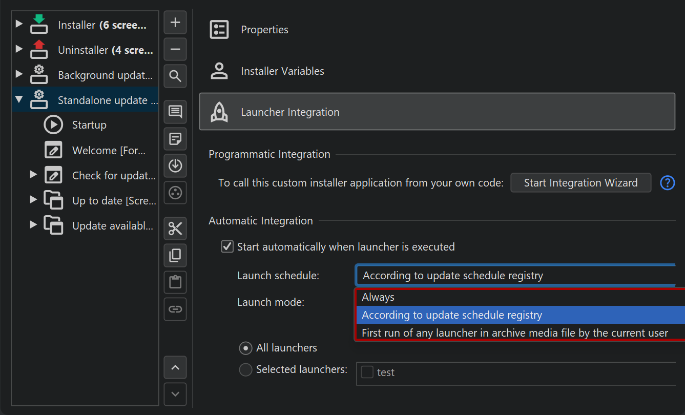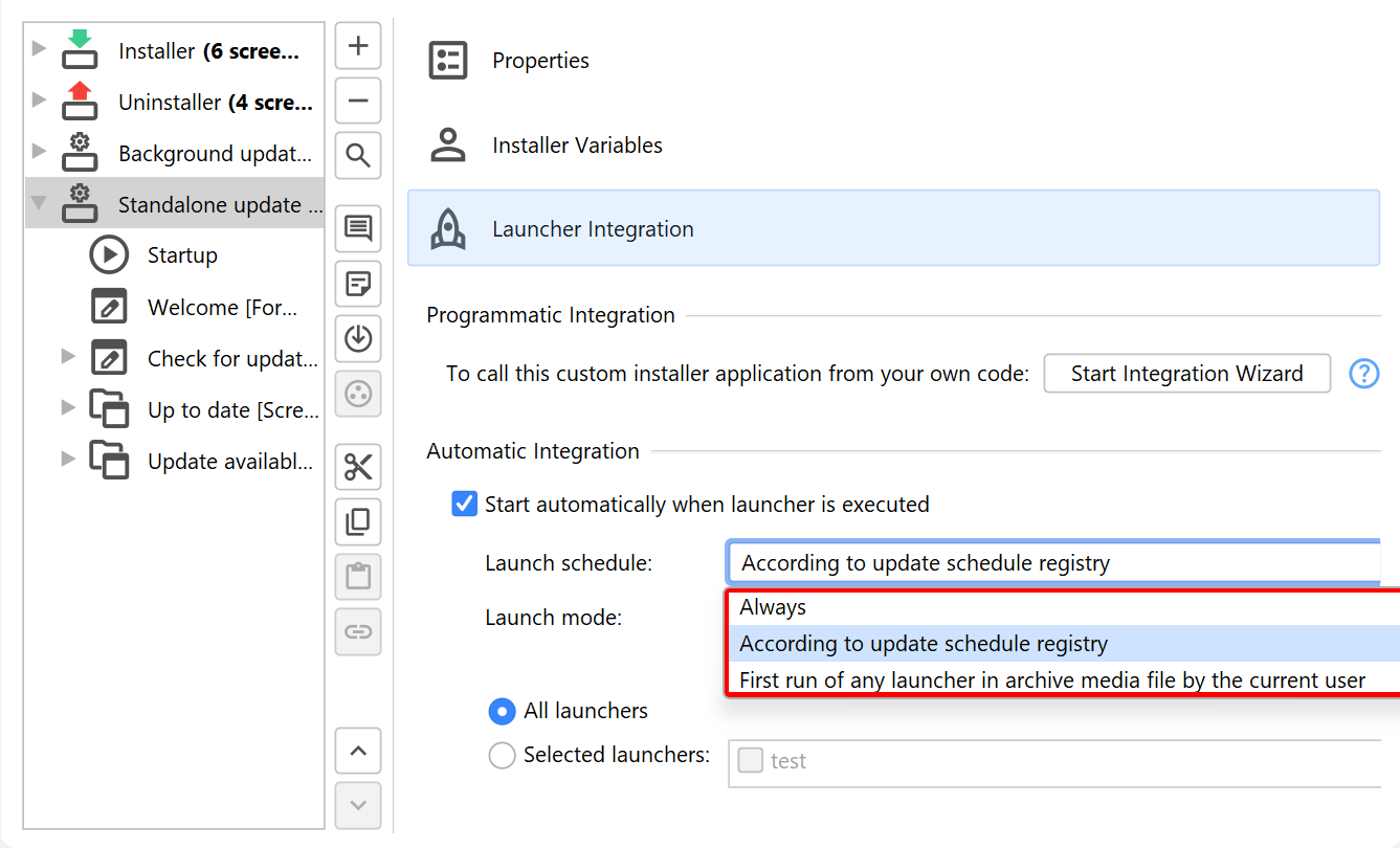 To control how often this update check is performed, you can adjust the "Launch schedule". By default, it uses the frequency that is set it in the "Update schedule registry". To initialize the update schedule registry, you can add a "Configurable form" to your installer and add an "Update schedule selector" form component to it. In the installer, the user will then get the possibility to choose the frequency of the update checks.