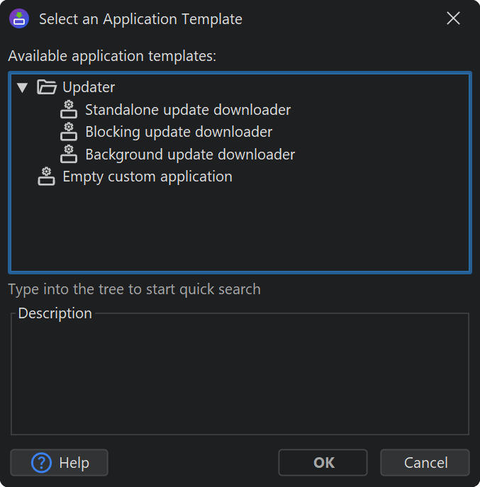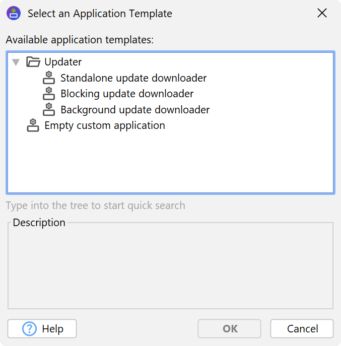 The "Blocking update downloader" application template is what is required in this case and is intended for automatic update checks. It looks for an update in the startup sequence and terminates the update downloader if no new version is available. This means that if there is no new version available, your users will not see that a check has taken place. Only if a new version is available will the update downloader display its window and inform the user of the possibility to download the update installer.