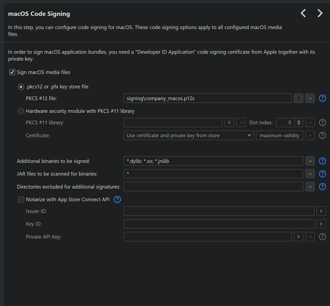 For this purpose, install4j lets you configure a list name pattern for binaries. All files in the distribution tree are matched against these patterns, and if a match is found, the corresponding file is signed if it is really a MACH-O binary. The reason why install4j cannot just automatically check all files in this way is that this check is rather expensive.