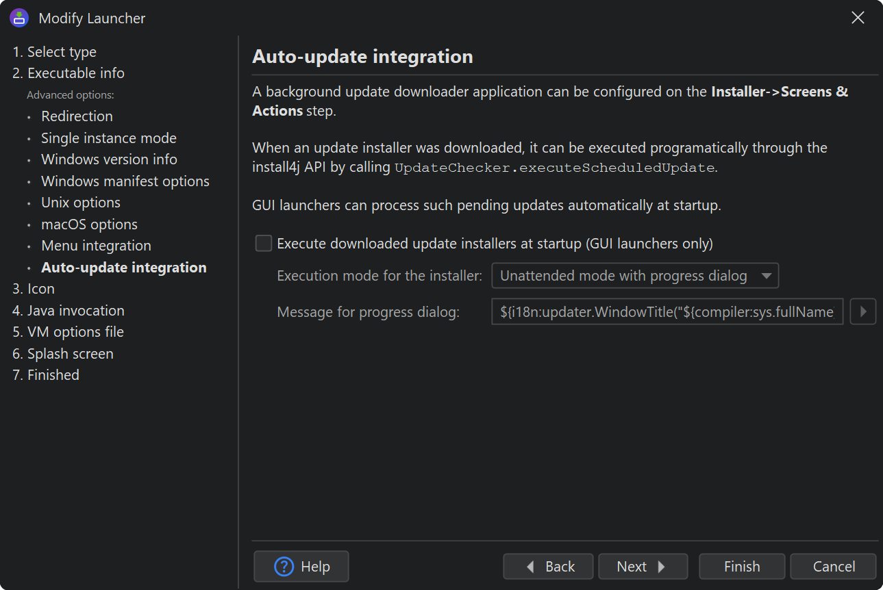 in the "Executable info->Auto update integration" step of the launcher wizard. When this GUI launcher is