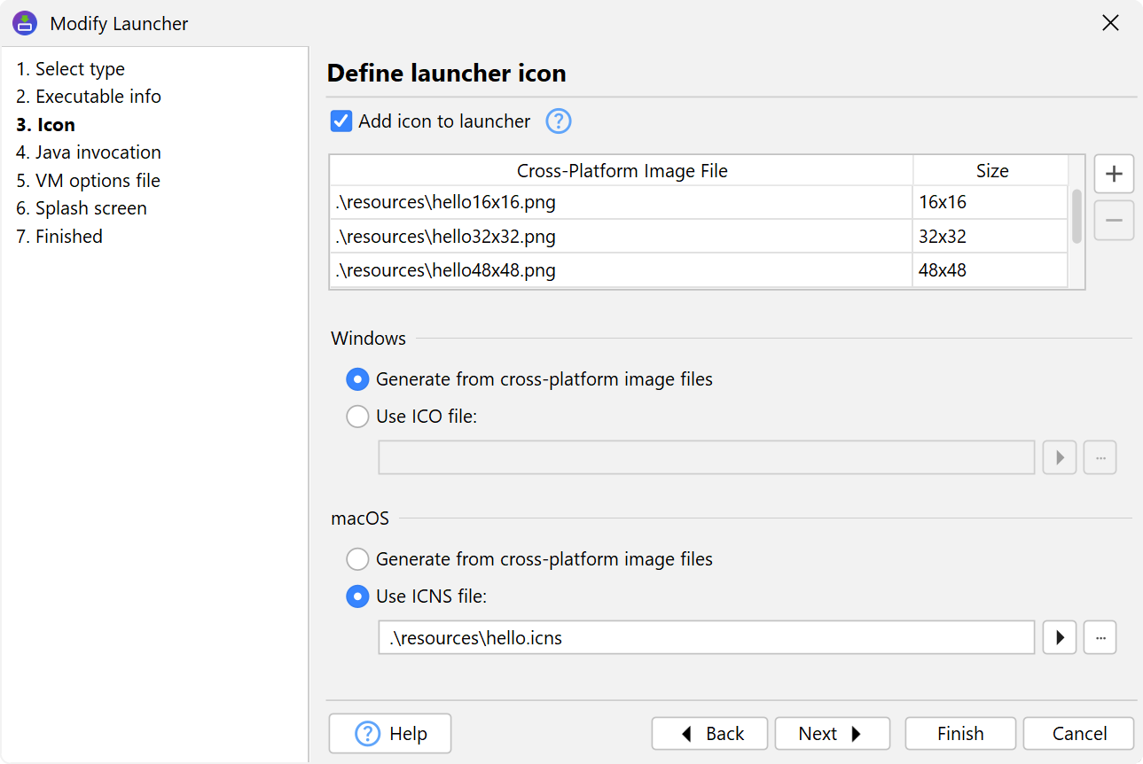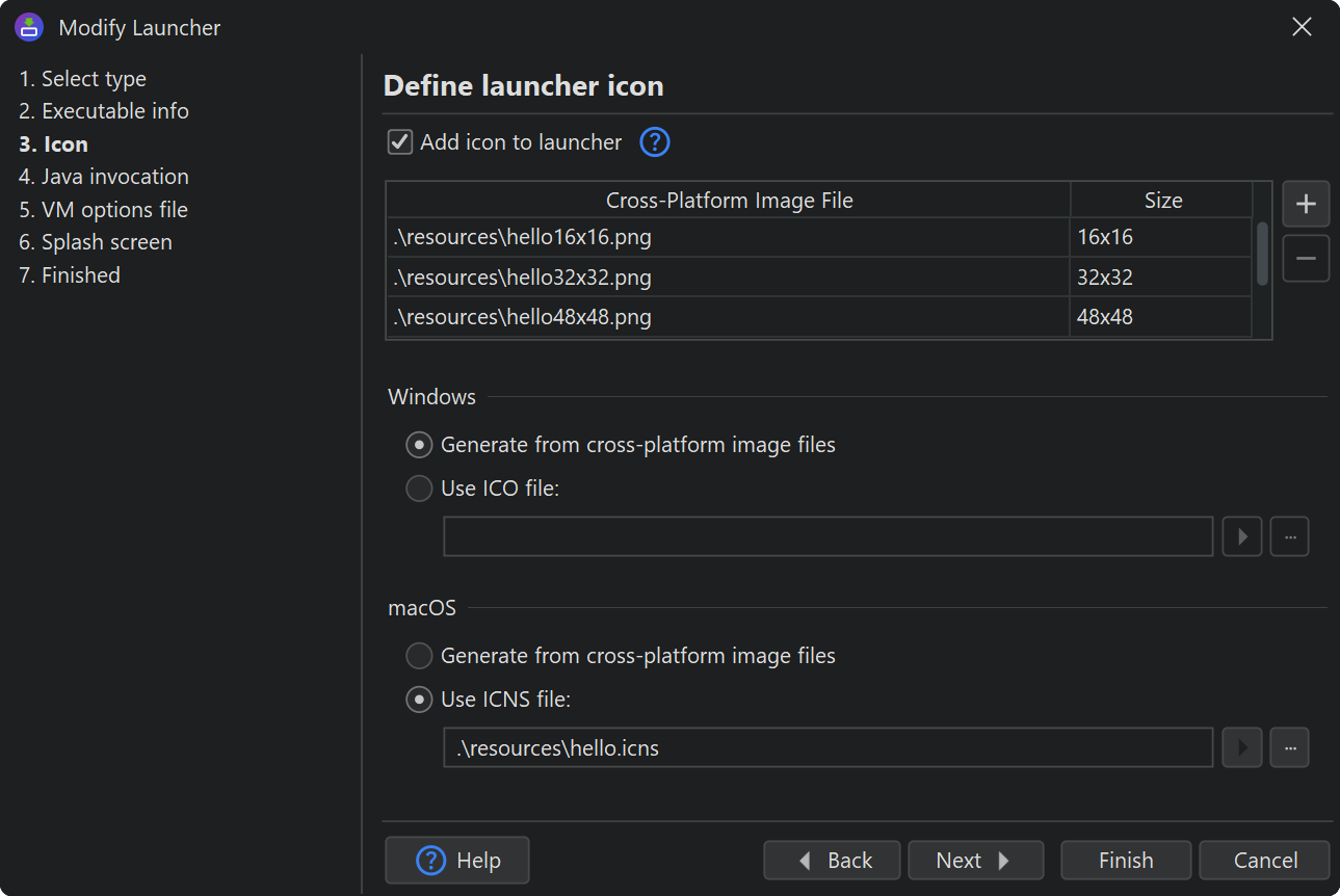 Icons for launchers can be generated from a set of PNG files. On Windows, an .ico file and