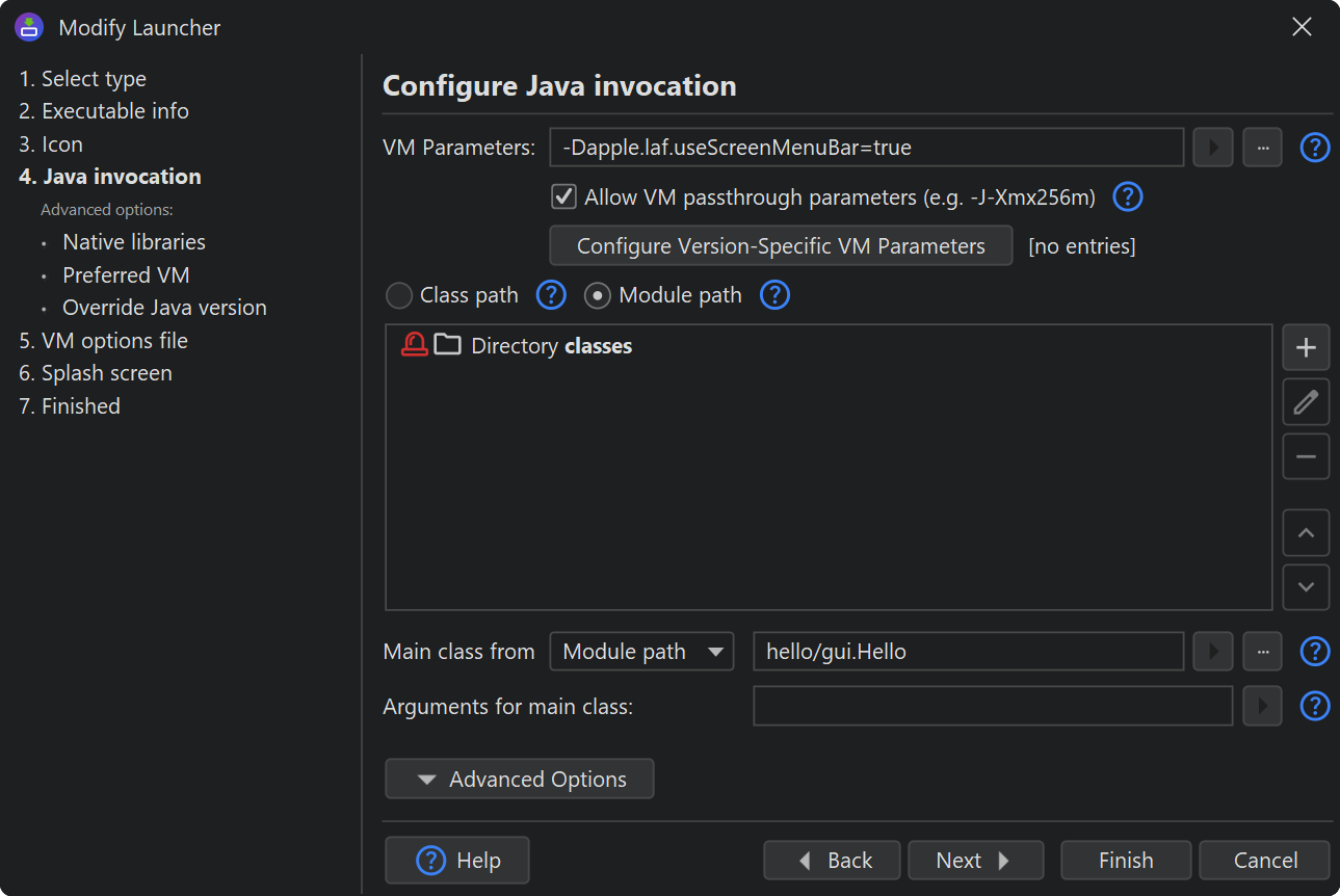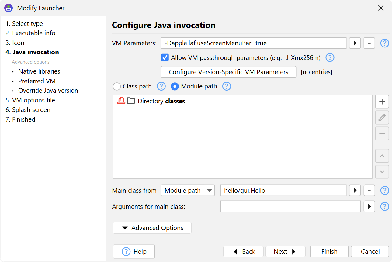 The most important configuration of a launcher is done on the "Java invocation" step of the launcher wizard and revolves around replicating the arguments you would pass to the Java launcher in a batch file: