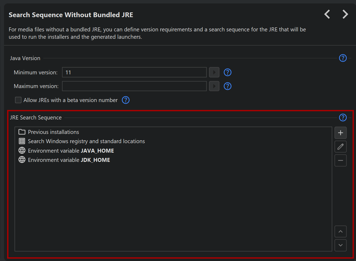 By default, launchers use the bundled JRE. In case you do not bundle a JRE, the JRE search sequence determines how install4j searches for a JRE on the target system. New configurations get a pre-defined default search sequence.