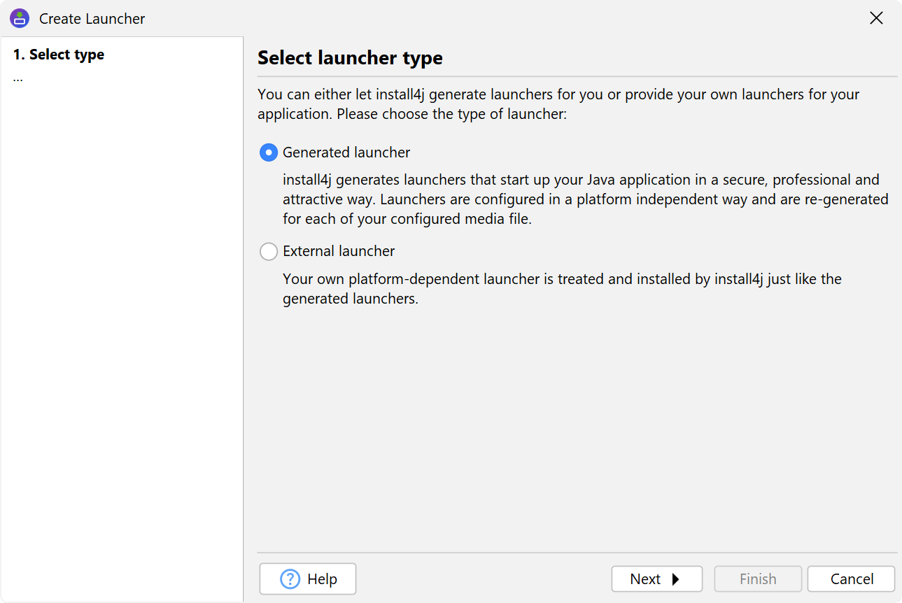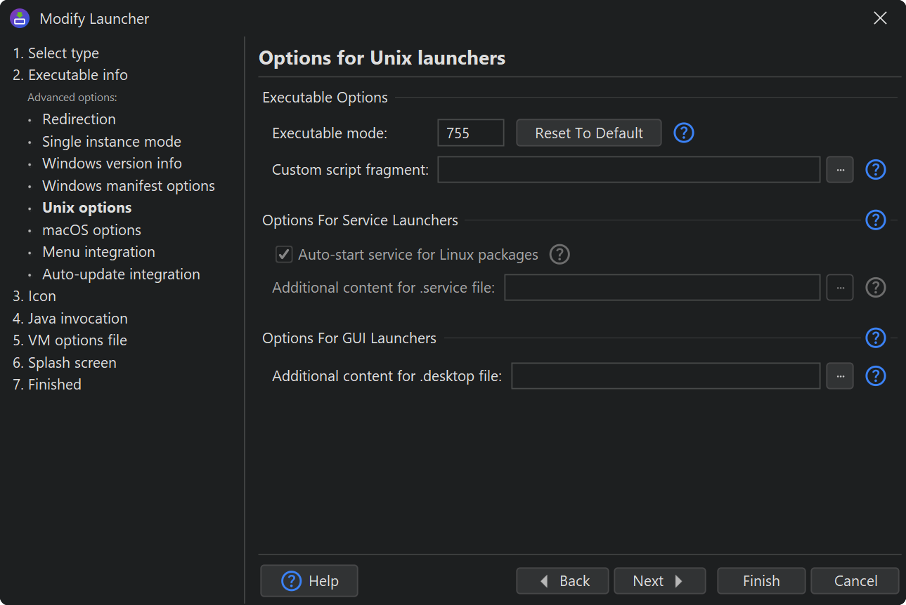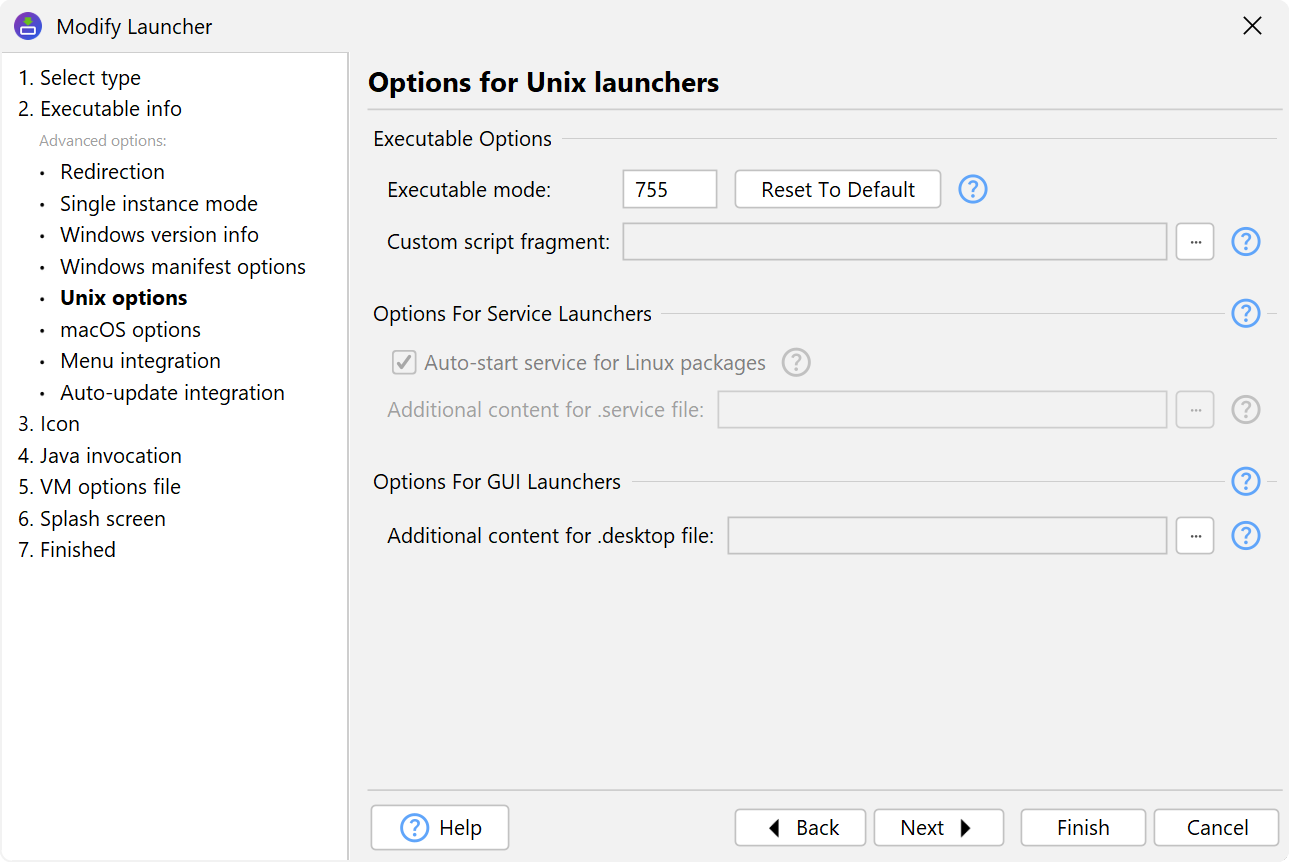 If you already have an external launcher for your application, you can let install4j use that launcher instead of generating one. Because external launchers are most likely platform-dependent, you will have to add external launchers for each platform that is targeted by your media files. Make sure to exclude the irrelevant launchers in your media file definitions in this case.If the launcher is a binary file rather than a shell script, make sure to set its Unix mode in the distribution tree to a value that makes it executable for the owner, such as 755 or 700. This also affects the generated .desktop file whose
