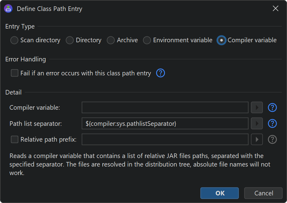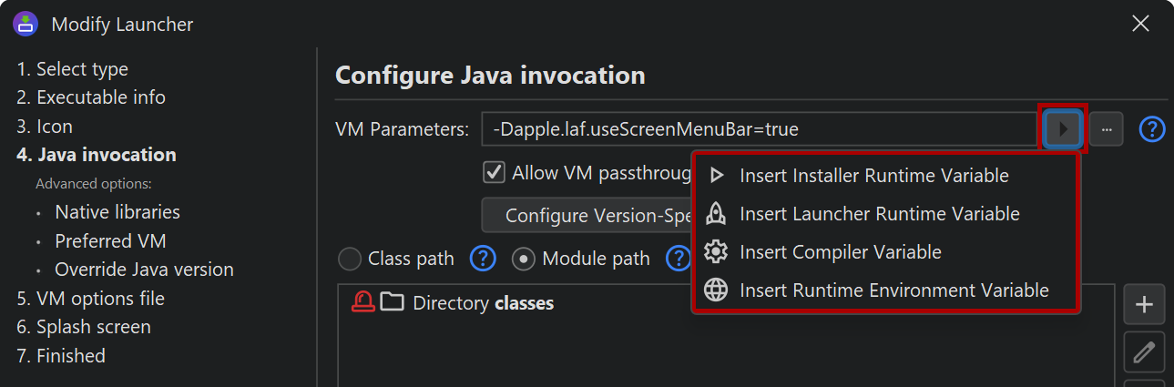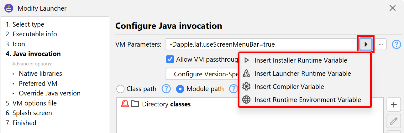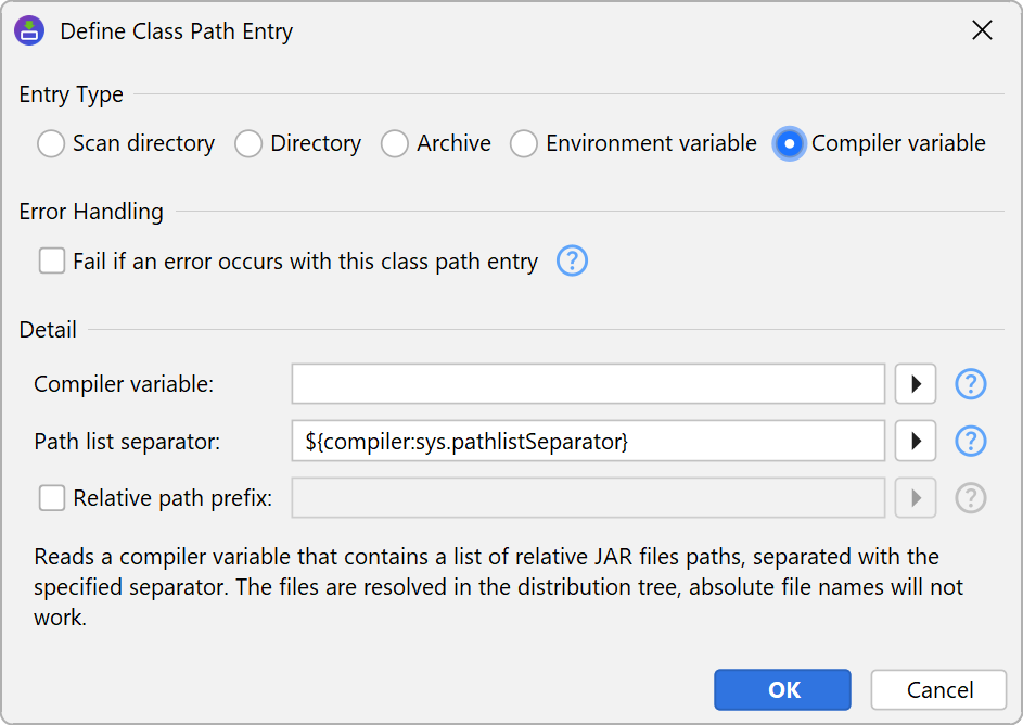 --module-pathand the-cpparameters of the standard Java launcher. The module path is only applicable for Java 9 and higher. Like for the standard Java launcher, you can add directories, single archives or directories with archives. In addition, you can add archives from environment variables and from compiler variables.The compiler variable entry is useful if the set of JAR files that should be added to the module path or class path is calculated in your build system and these JAR files are not staged to a fixed set of directories that you could reference in install4j. In that case, the the command line compiler as well as the plugins for Gradle, Maven and Ant can set a compiler variable externally where the single JAR files are separated by a configurable separator.