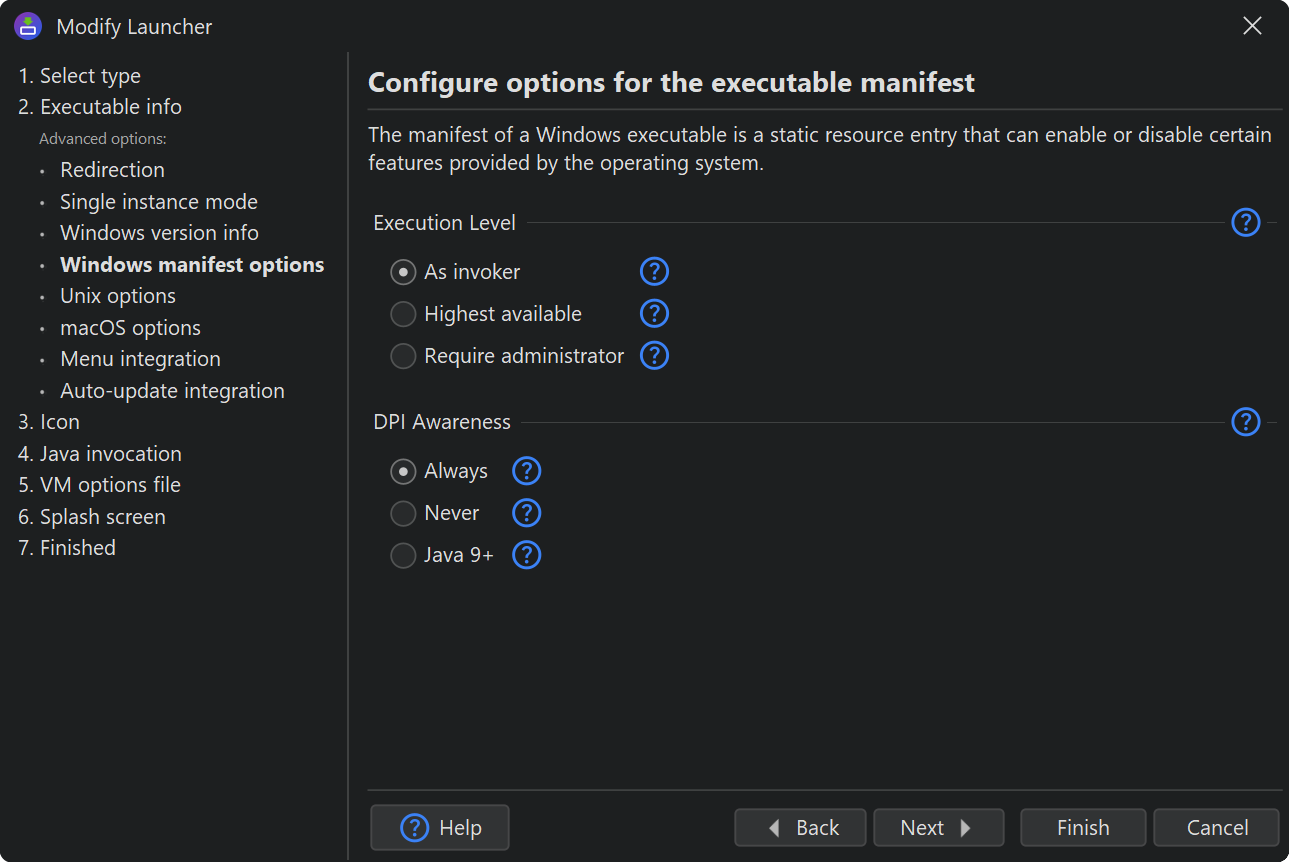 On the "Executable->Windows manifest options" step you can adjust the contents of the executable manifest, a static resource in the executable that controls some Windows features.