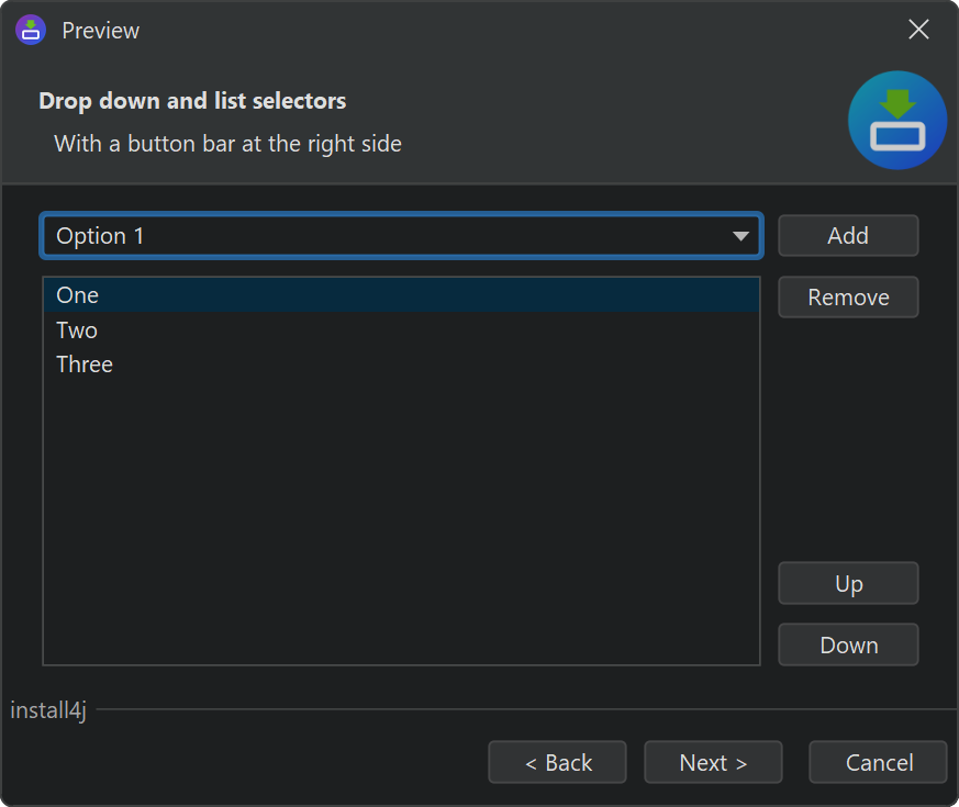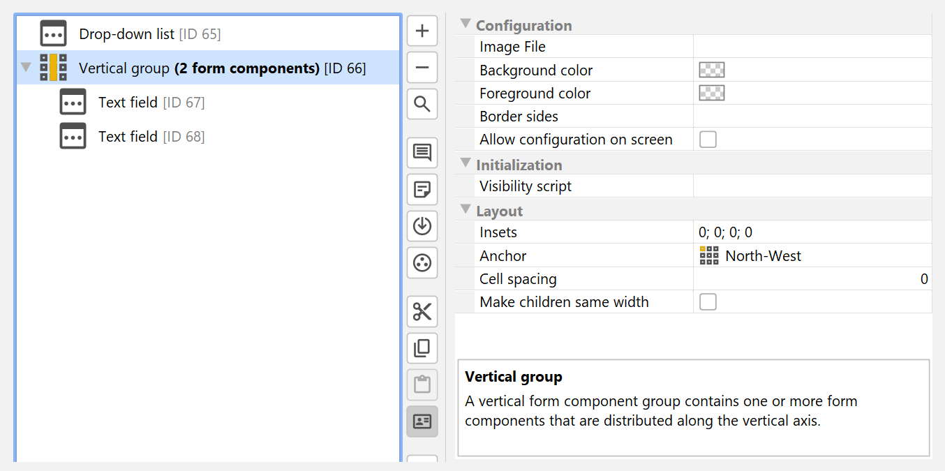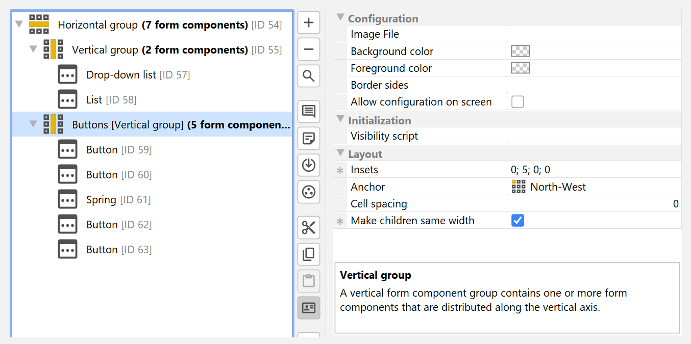 In this case the second column with the buttons takes up a fixed amount of horizontal space, because buttons do not automatically grow beyond their preferred size. To make all buttons of equal size, the "Make children same width" property has been selected. Two buttons are aligned at the top of the column, two buttons at the bottom. This is achieved with a "Spring" form component after the second button that has its axis set to "Vertical". It pushes all further components to the bottom.