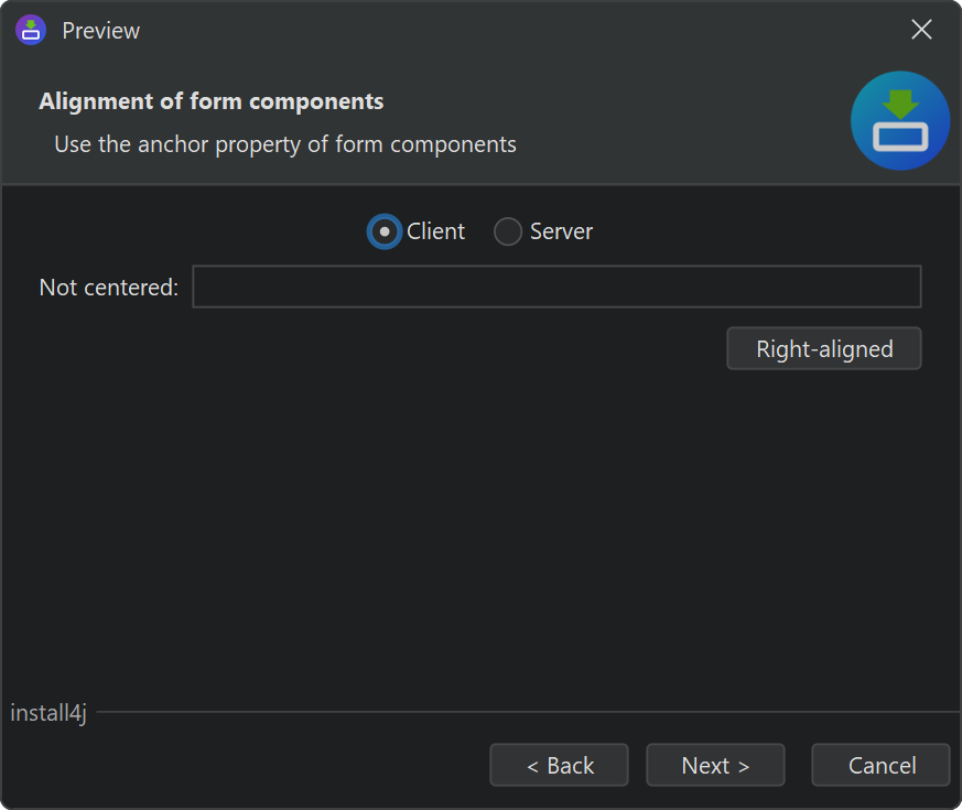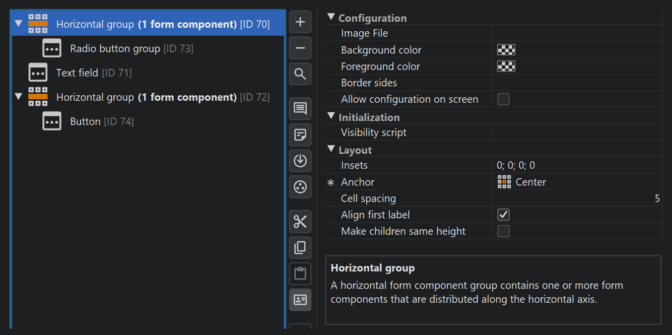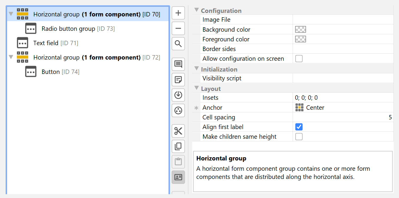 For the layout group with the radio button group, the anchor has been set to "Center", for that with the button the anchor has been set to "East". This only works with form components that do not grow horizontally. Some form components that do grow horizontally can be restricted to a fixed horizontal size, such as the text field by specifying a non-zero column count.