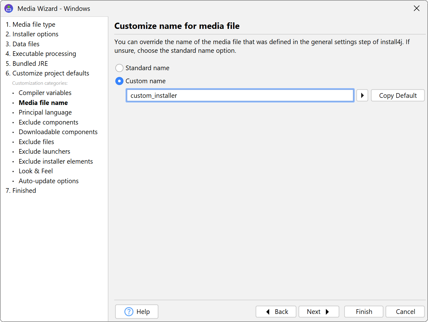 Because it is often necessary to change the name of the media file from the global media file pattern configured on the "General Settings->Media File Options" step, a separate customization step is available in the media wizard. For example, you may want to produce two different variants for the same platform with and without some particular files. To avoid a name clash of the two media files, you have to adjust the name of one or both of the media files.