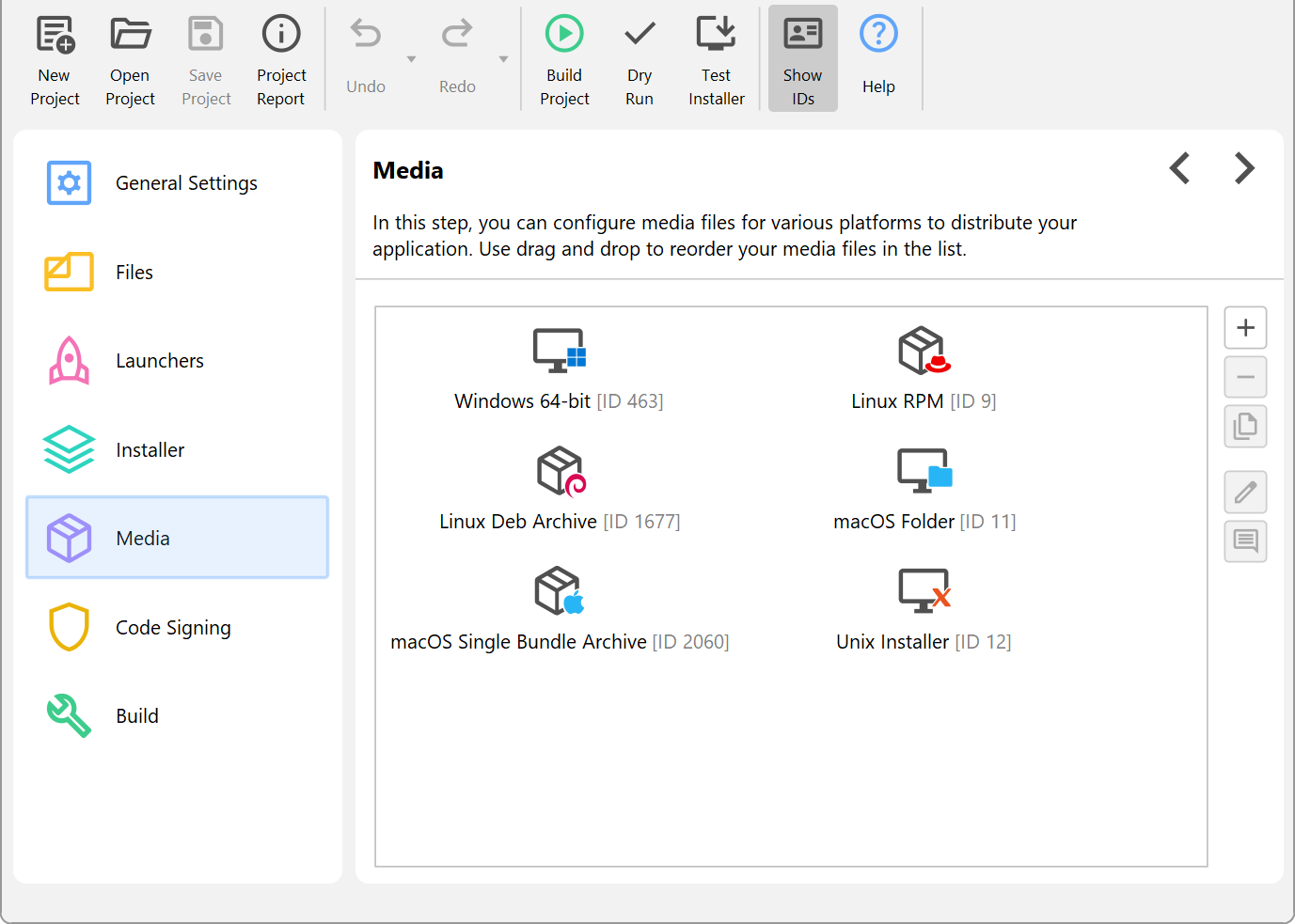 Media files are the final output of install4j: single artifacts that are used to distribute your application to your users. The creation of a media file has platform-dependent options, so for each platform, you have to define a separate media file. It also makes sense to define several media files for one platform in case you wish to distribute different subsets of your distribution tree, or if you distribute your application with and without a bundled JRE.