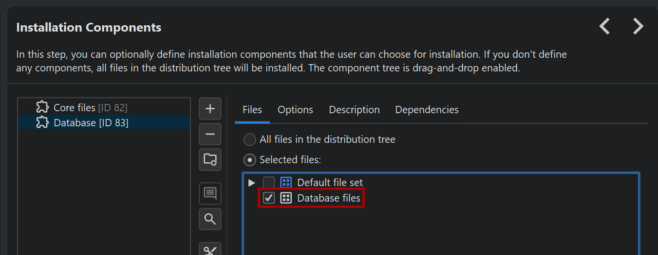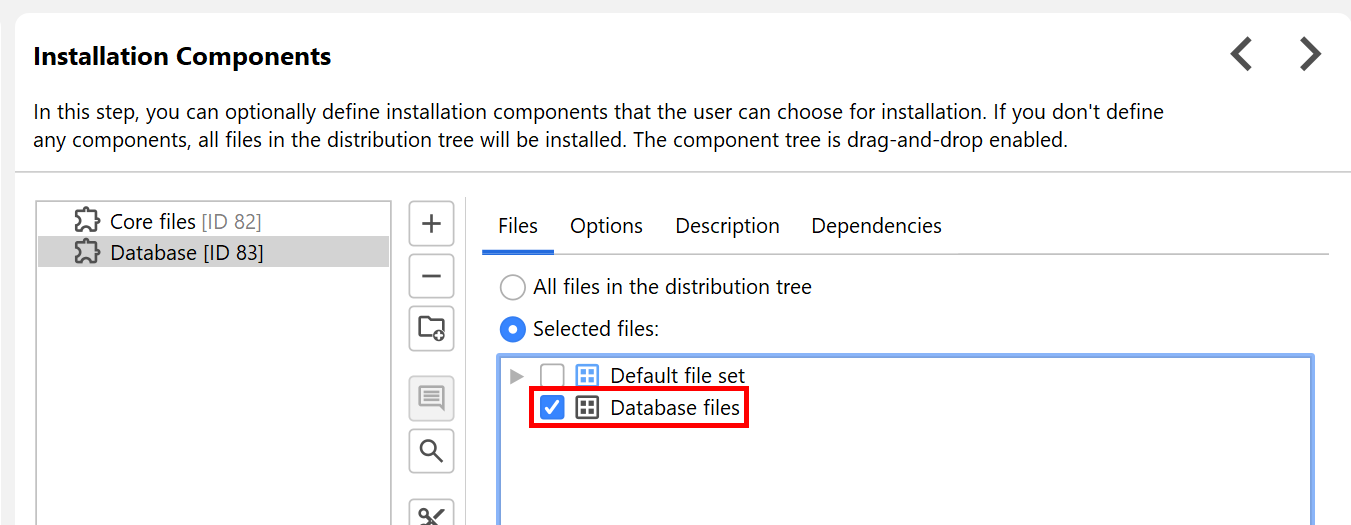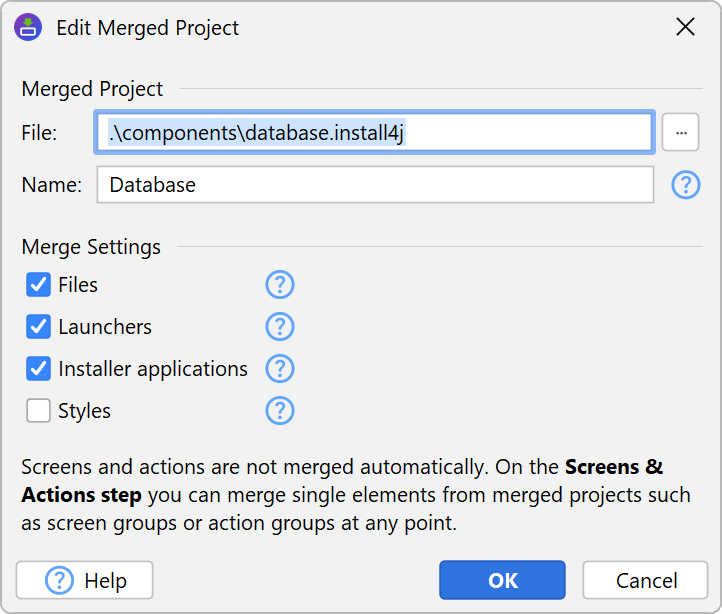 Both launchers and custom installer applications can be attributed to a particular file set. In that case, they are only merged if the file set also exists in the main project. The attribution to a particular installation component in the main project is done in the same way as for files.