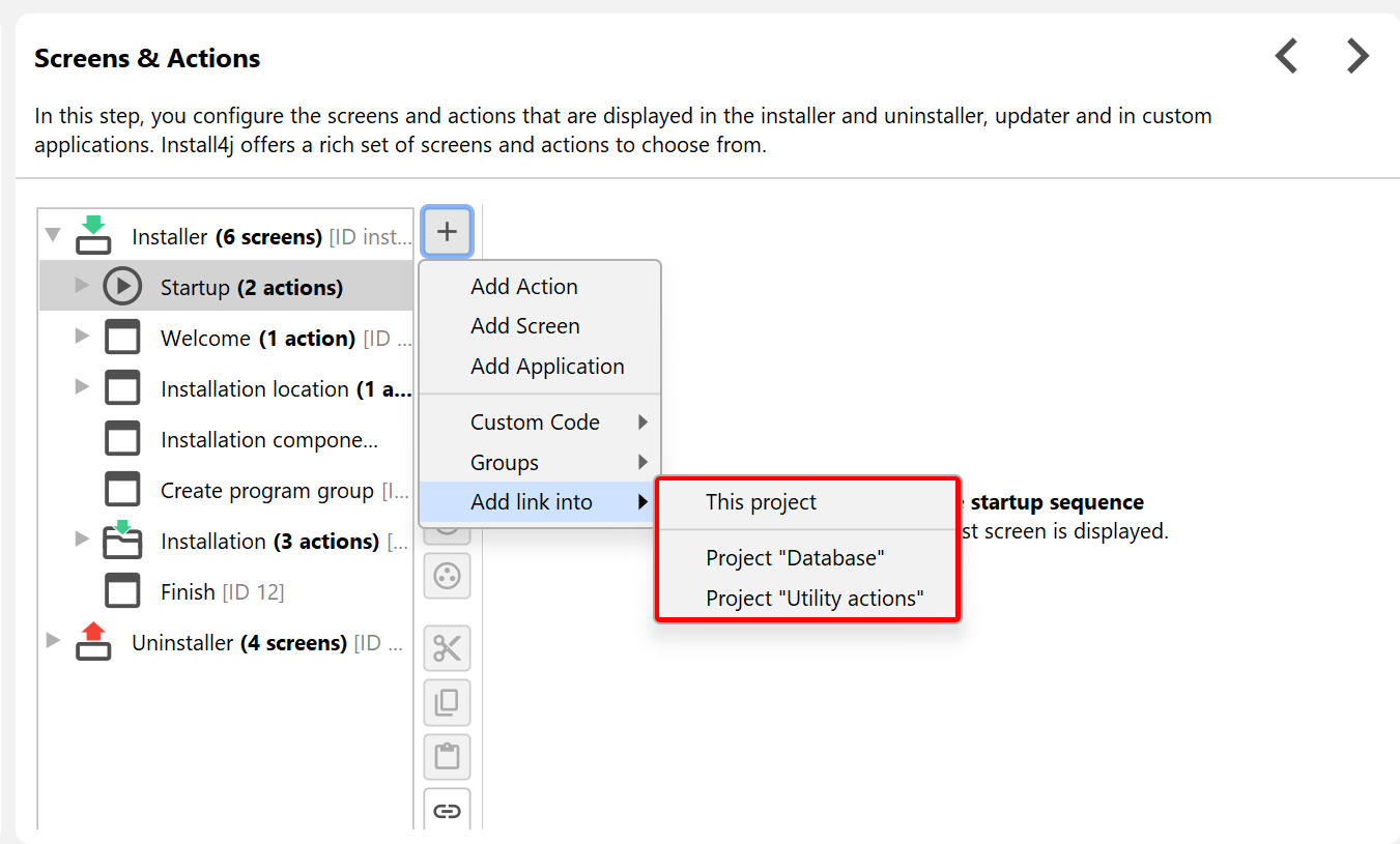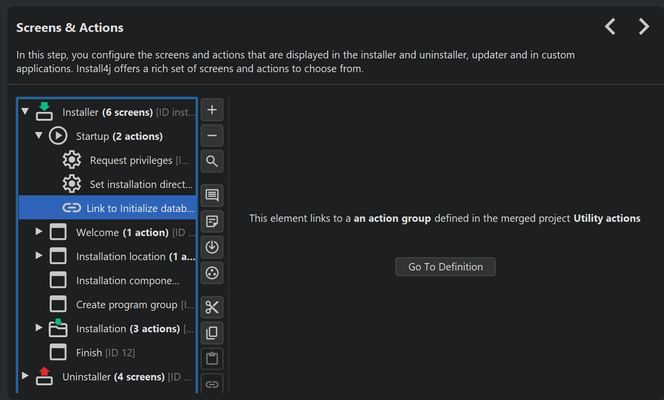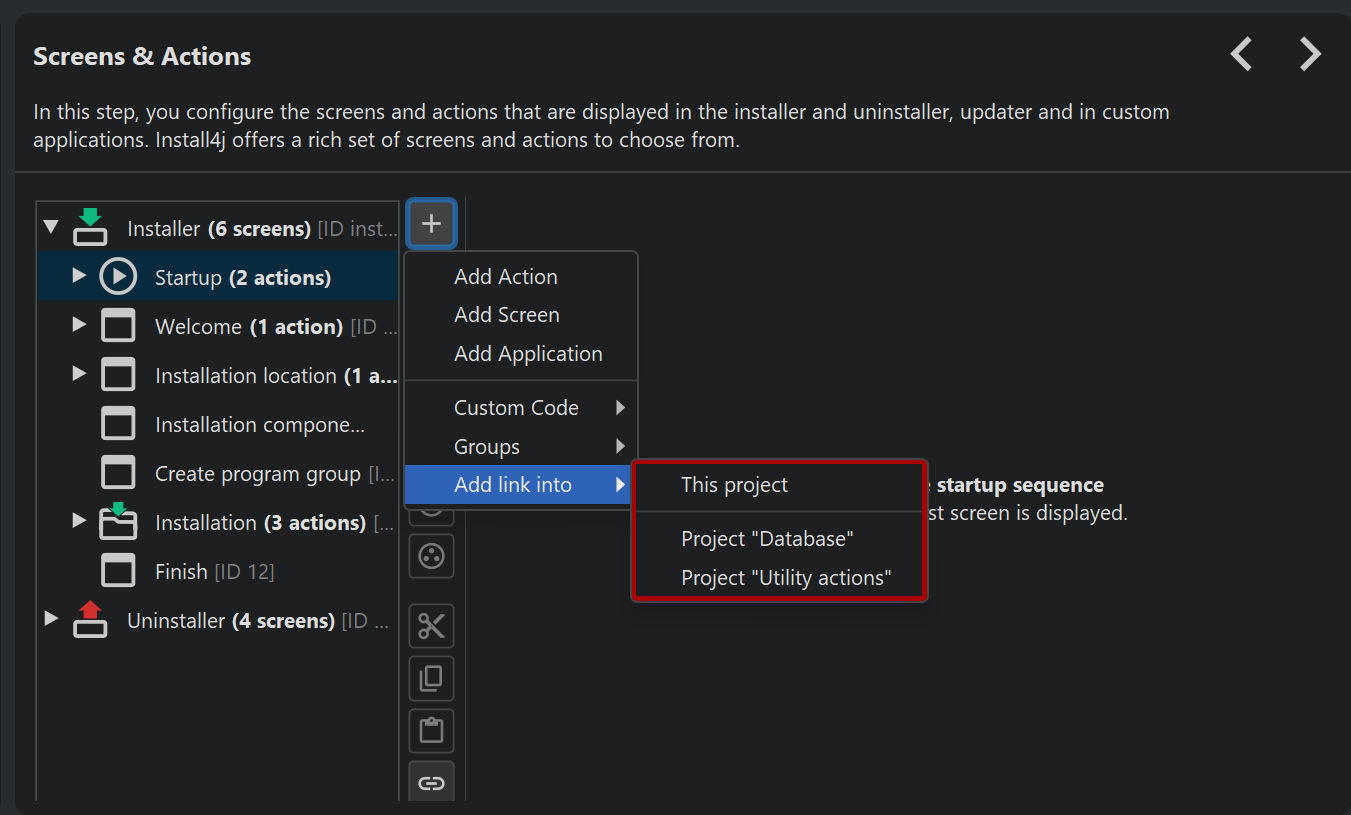 When adding links, the install4j IDE, shows special nodes that do not show any structure but just a button that opens the target of the link in a different window. At compile-time, the target elements are inlined. This means that at runtime, it appears as if all merged elements were defined directly in the main project.
