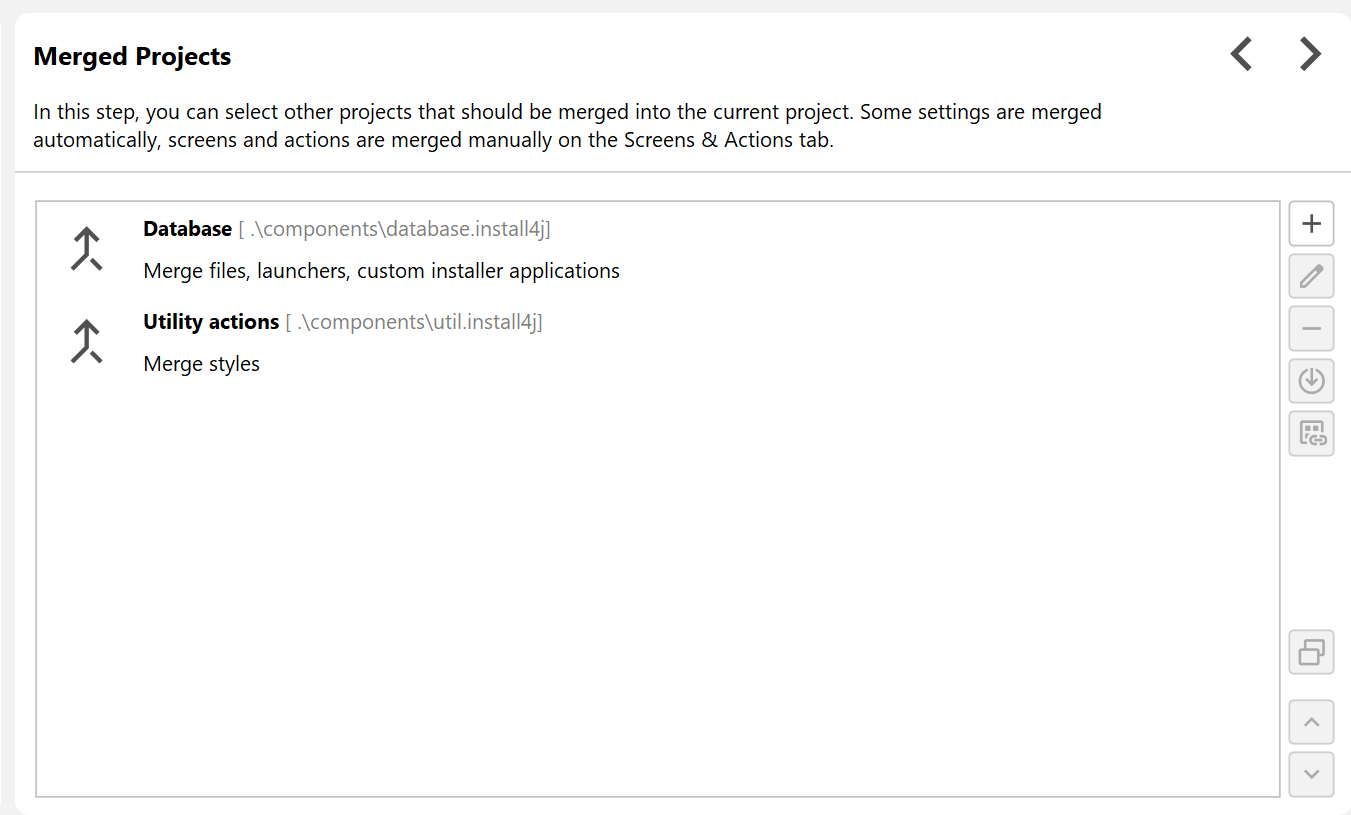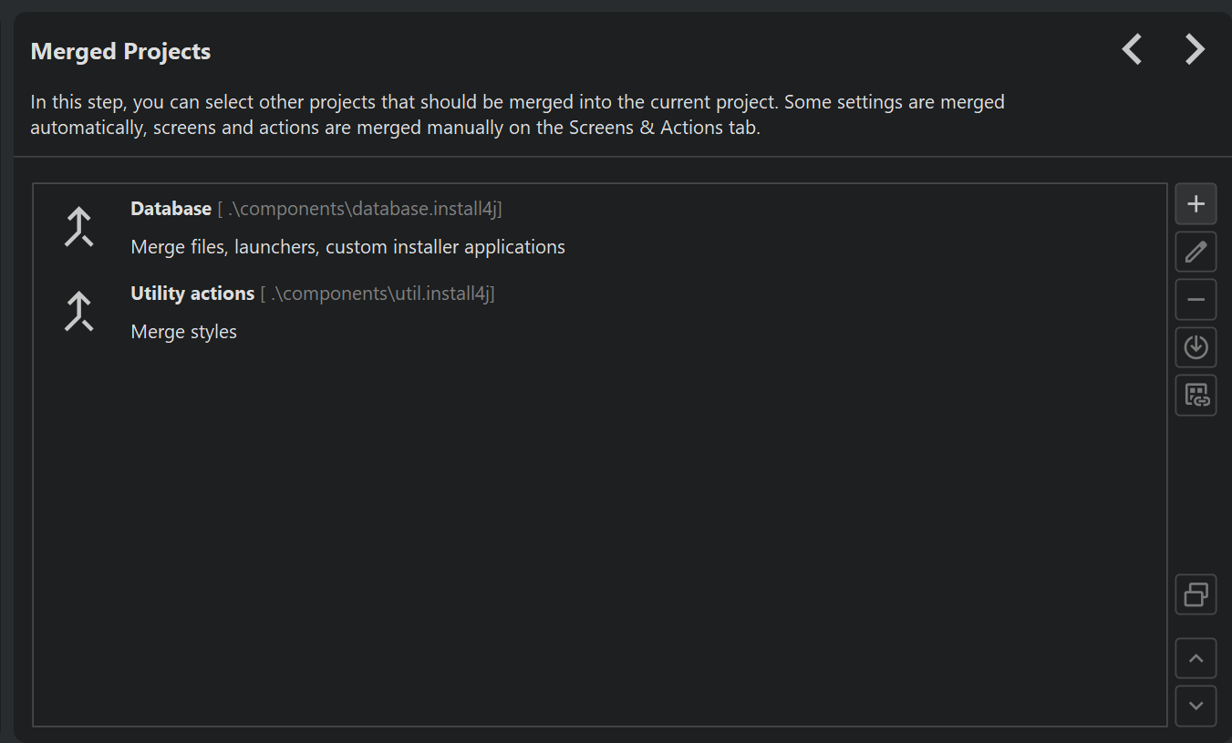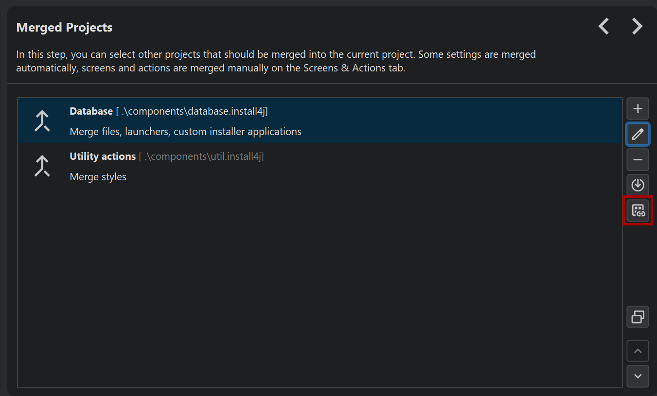 When adding links, the install4j IDE, shows special nodes that do not show any structure but just a button that opens the target of the link in a different window. At compile-time, the target elements are inlined. This means that at runtime, it appears as if all merged elements were defined directly in the main project.