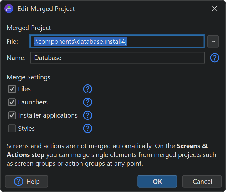 By default, files, launchers and custom installer applications are inserted. The corresponding merged elements are only added at compile-time and will not be visible in the main project. You can change merge options for each merged project individually.