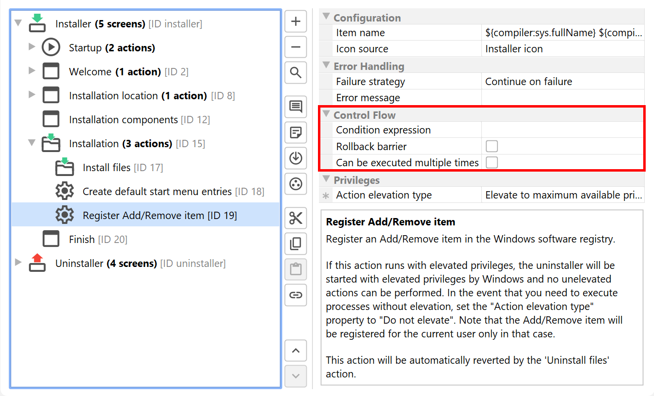 By default, only the "Installation screen" is a rollback barrier. This means that if the user cancels while the actions attached to the installation screen are running, everything is rolled back. If the user cancels on any of the following screens, nothing that was performed on or before the installation screen is rolled back. With the "Rollback barrier" property of actions and screens you can make this behavior more fine-grained and customize it according to your own needs.