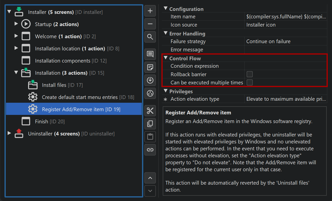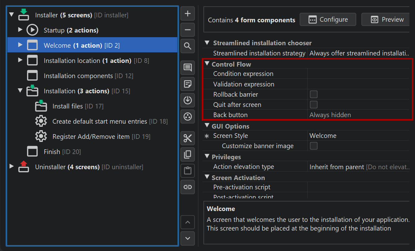 With screens and actions you configure two separate aspects of the installer: the user interface that is displayed by your installer and uninstaller, on the one hand, and the actual installation and uninstallation on the other hand. Each screen can have a list of actions attached that are executed when the user advances to the next screen.