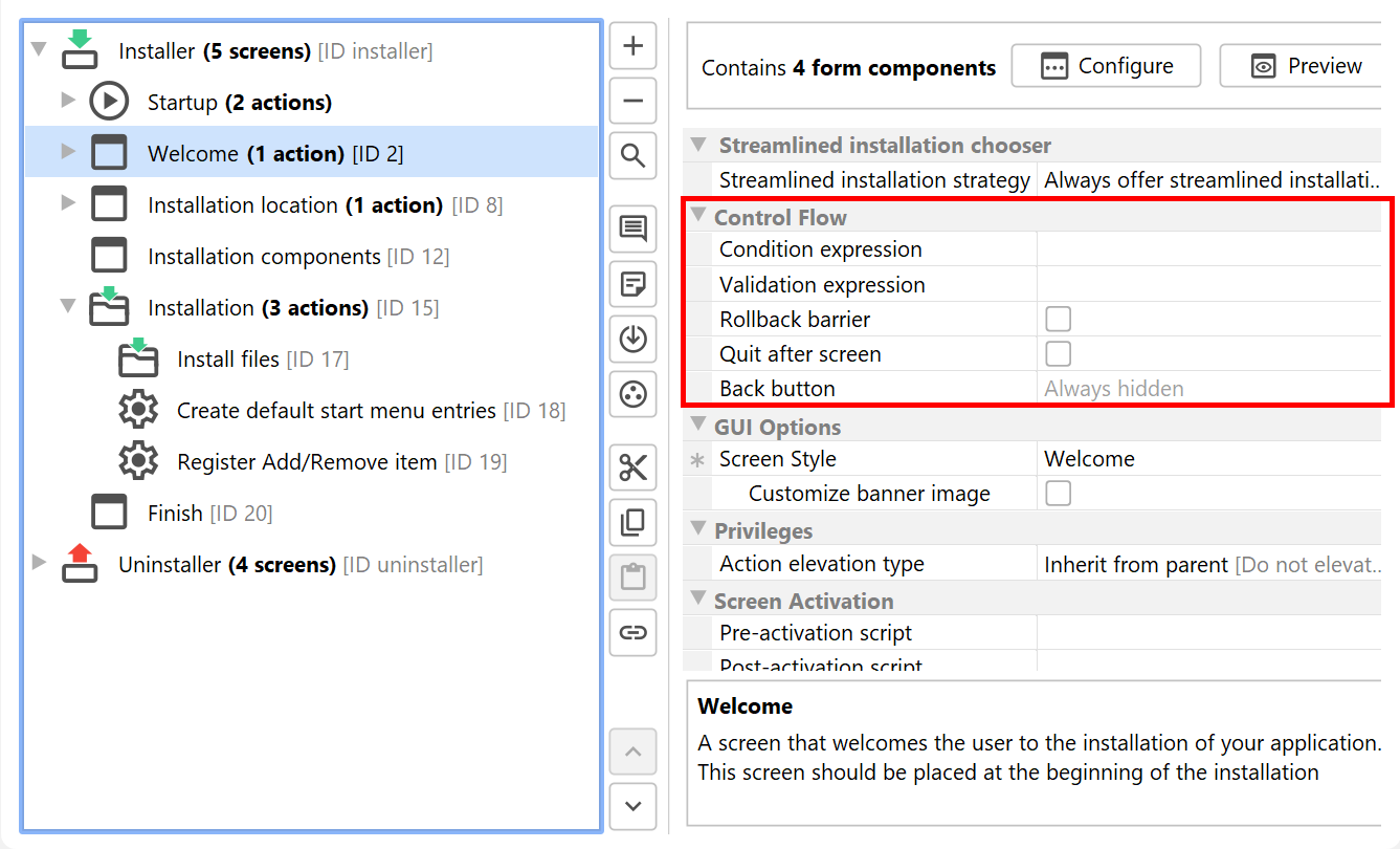 At runtime, install4j instantiates all screens and actions and organizes the screen flow and action execution. There are a number of aspects regarding this control flow that you can customize in the install4j IDE.