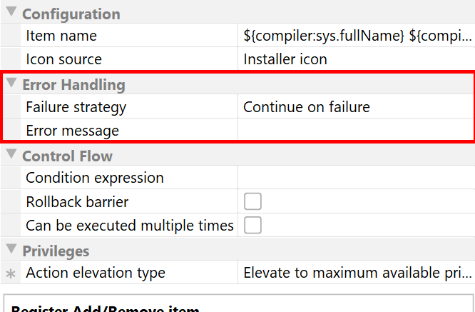 Standard actions in install4j fail silently. For example, the "Create a desktop link" action will not display an error message if the link could not be created. For all available failure strategies, you can configure an error message that is displayed in the case of failure. The "Install files" action has its own, more granular failure handling mechanism that is automatically invoked after the installation of each file.