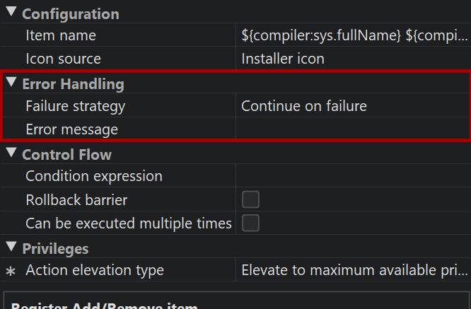 Every action has two possible outcomes: failure or success. If an action succeeds, the next action is invoked. When the last action of a screen is reached, the next screen is displayed. What should happen if an action doesn't succeed? This depends on how important the action is to your installation. If your application is not able to run without the successful execution of this action, the installer should fail and initiate a rollback. However, many actions are of peripheral importance, such as the creation of a desktop link. Declaring that the installer has failed because a desktop link could not be created and rolling back the entire installation would be counterproductive. That's why the failure of an action is ignored by install4j by default. If a possible failure of an action is critical, you can configure its "Failure strategy" to either ask the user on whether to continue or to quit immediately.