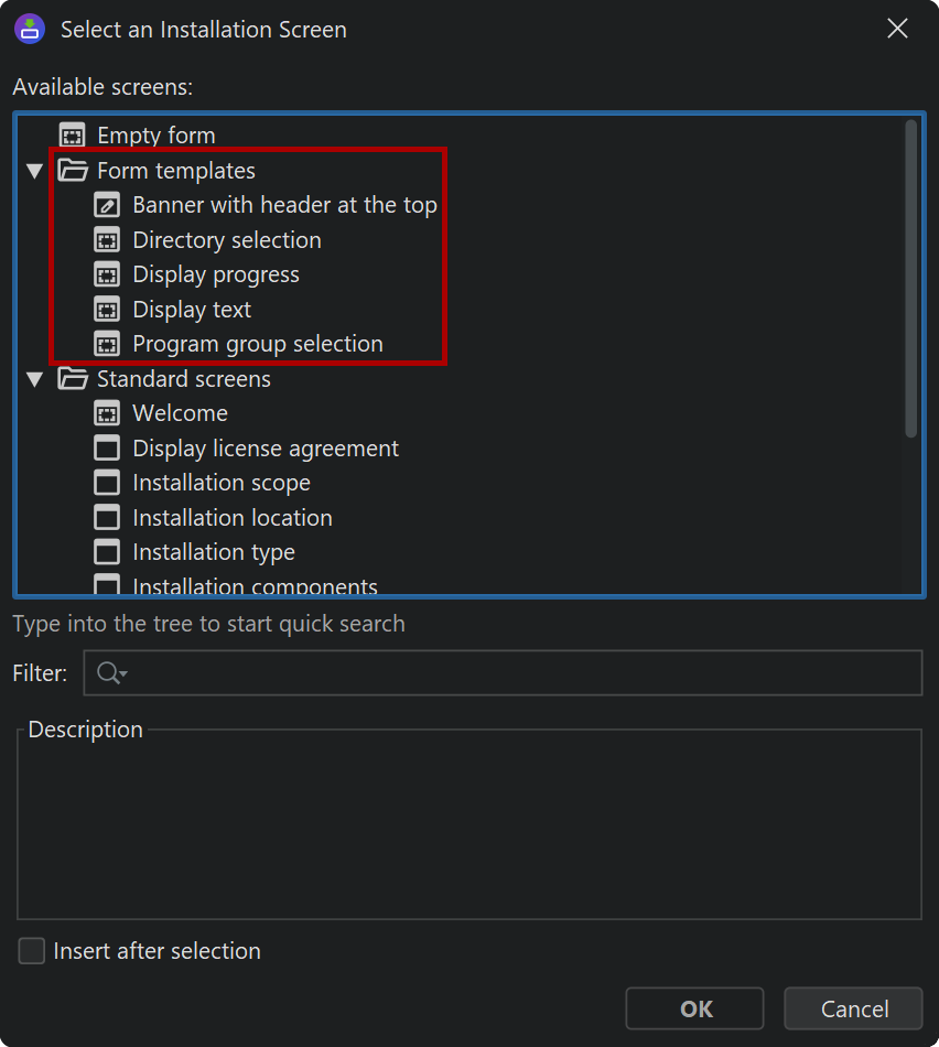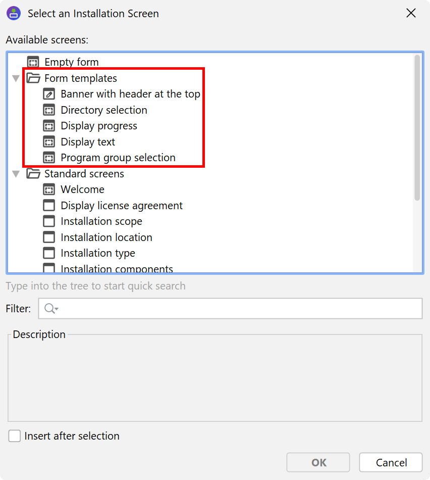 The form templates don't have a fully defined purpose, their messages are configurable and empty by default. For example, the "Display progress" screen is similar to the "Installation" screen, however, the title and the subtitle are configurable. For templates also do not have any restriction with respect to how many times they can occur. While the "Installation" screen (and other screens) can occur only once for an installer, the "Display progress" screen could be used multiple times.