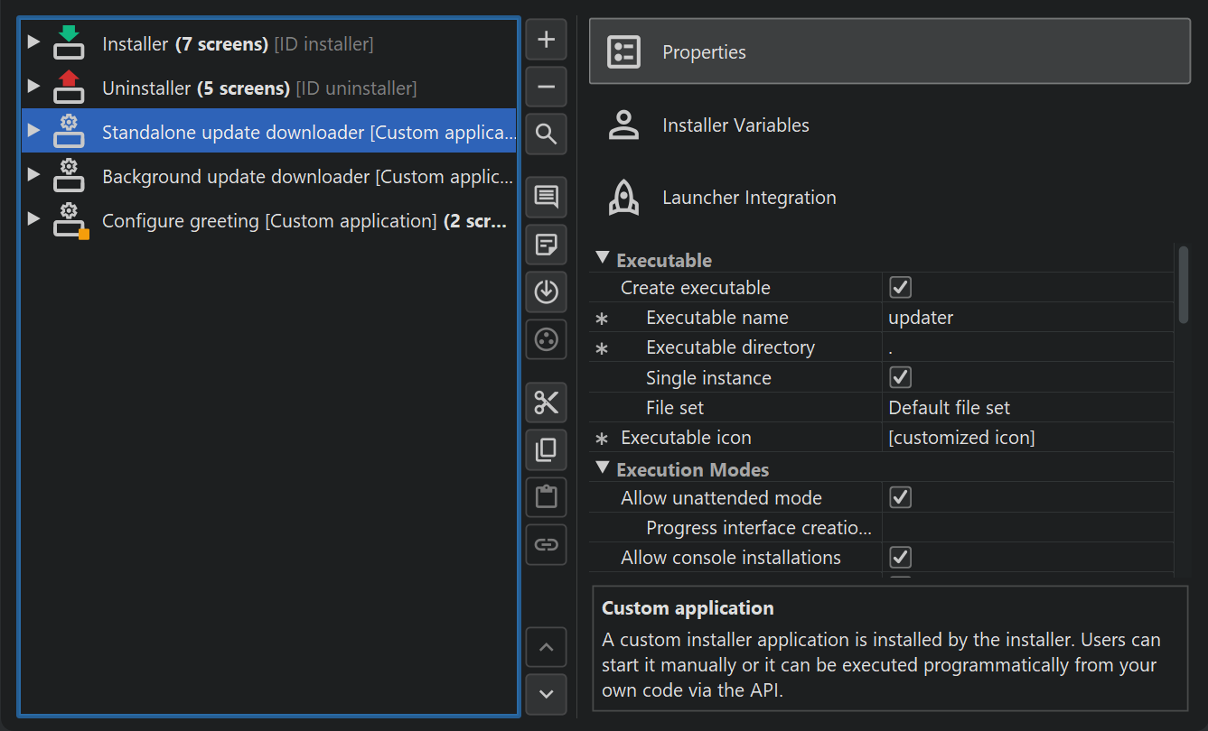 In addition to the installer and uninstaller, you can define custom installer applications that are added to the distribution tree. These custom installer applications can use the same screens and actions that the installer can use. Unlike installer and uninstaller, they are also added to archives. They can be used to write separate maintenance applications for your installations that are either invoked directly by the user or programatically by your application.