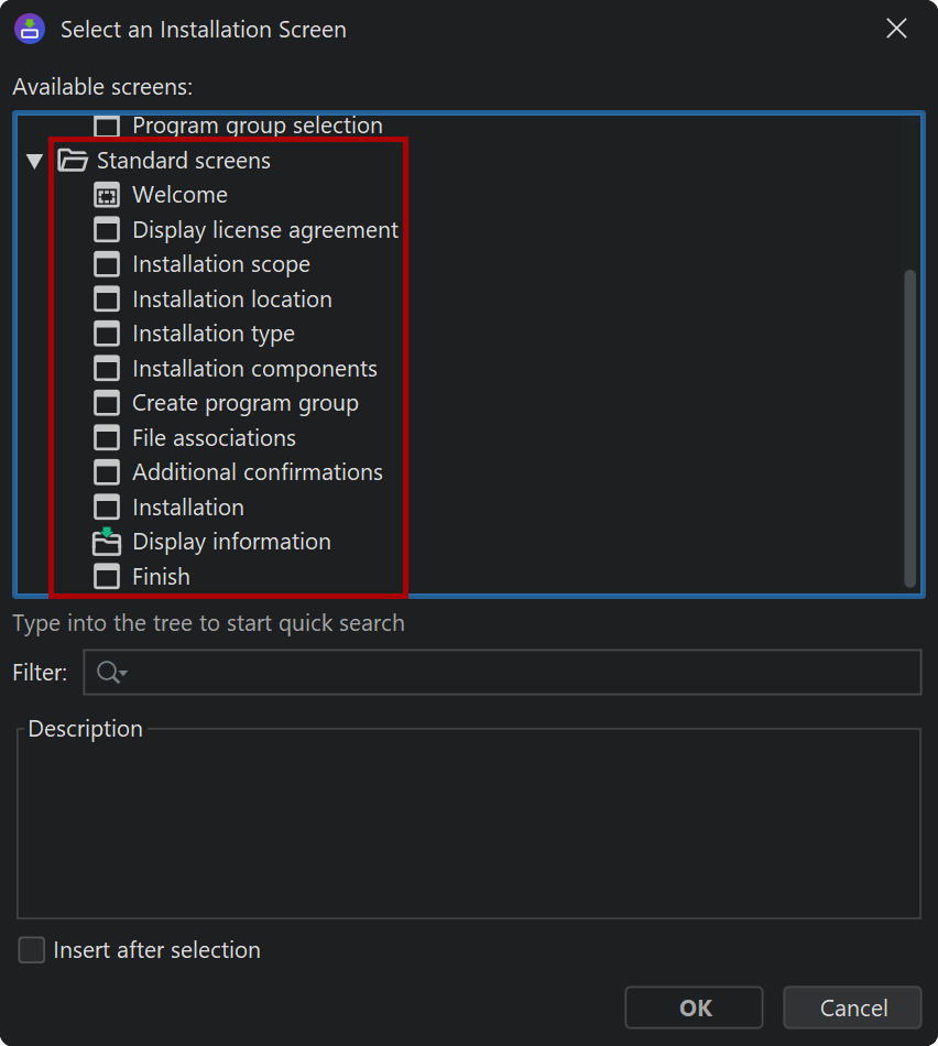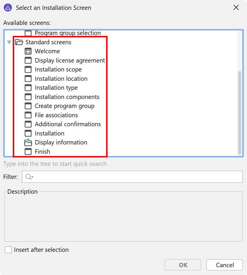 install4j offers a series of standard screens that are fully localized and serve a specific purpose. These standard screens have a preferred order. When you insert such a screen, it will insert itself automatically in the correct position. This order is not mandated, you can re-order the screens in any way you like, however, they may not yield the desired result anymore. If, for example, you place the "Services" screen after the screen with the "Install service" actions (typically the "Installation" screen), the "Services" screen will not be able to modify the service installations anymore and the default values are used.