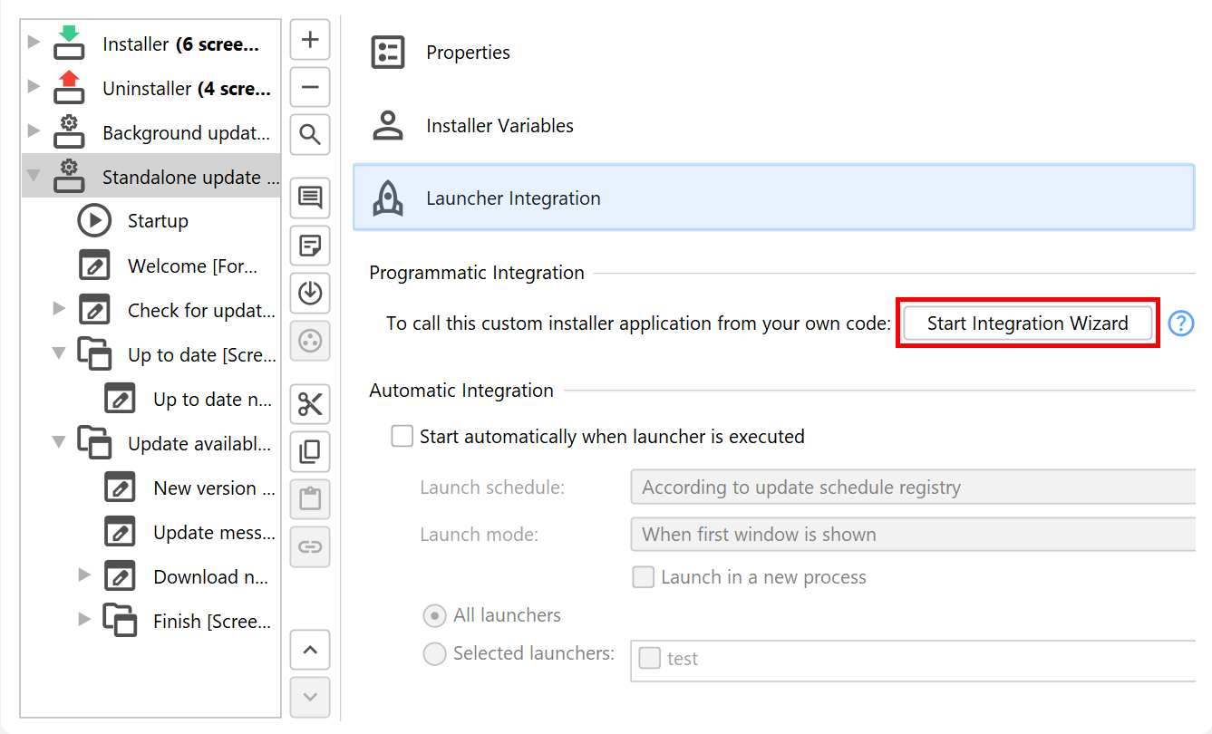To easily get such a code snippet for invoking the update downloader, select the update downloader application and click on the Start Integration Wizard button on the right.