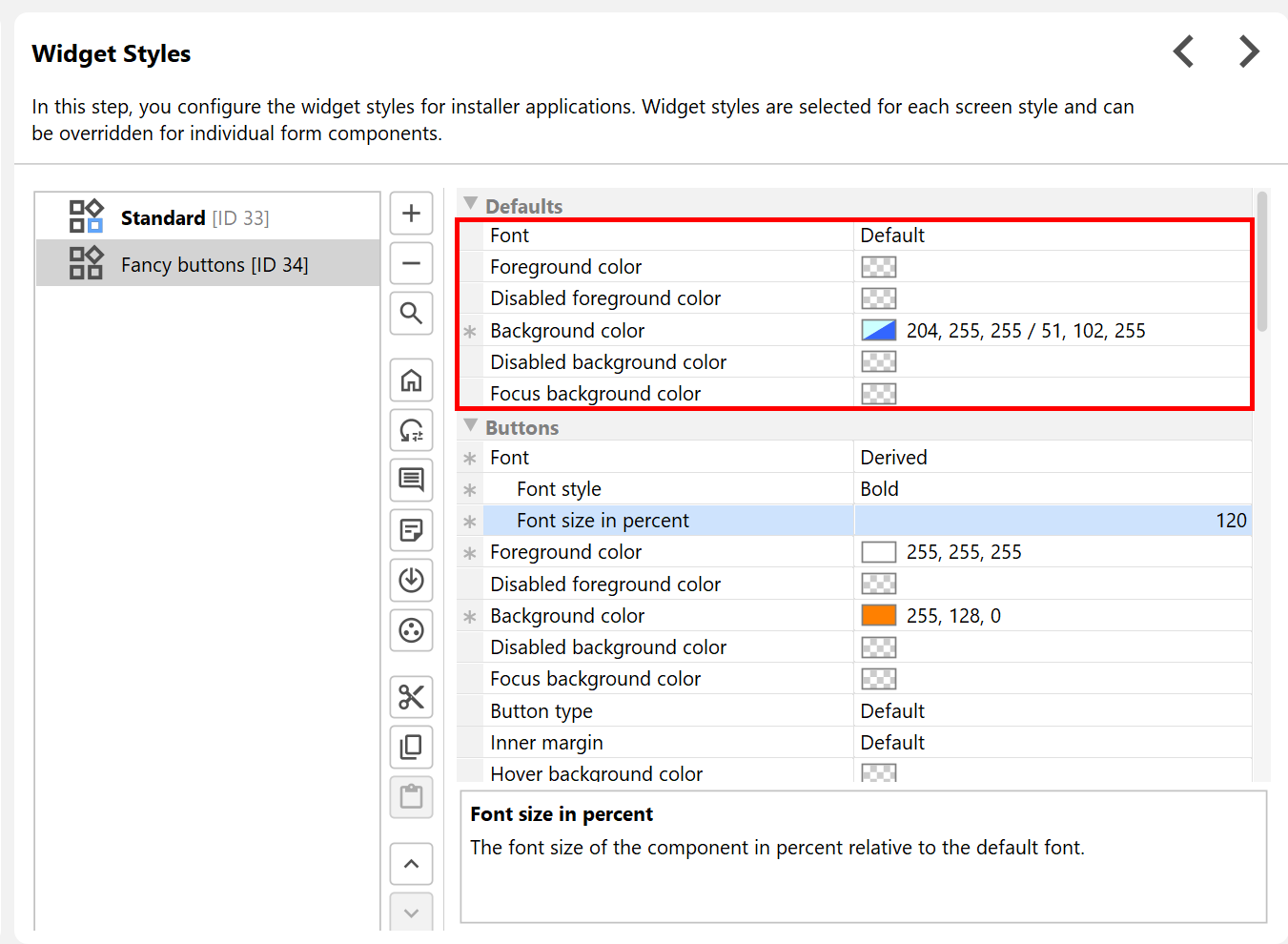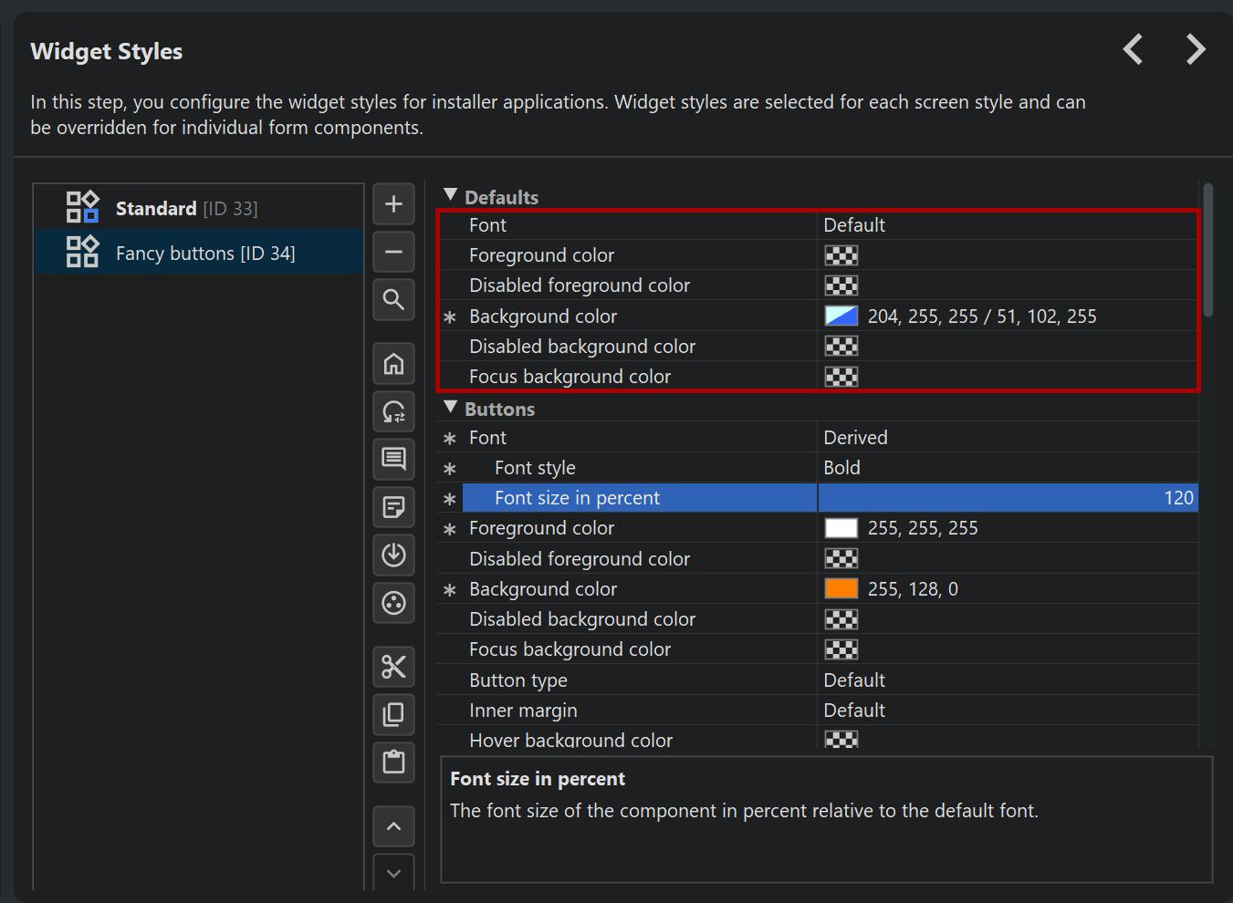 Project-wide widget styles are configured on the "Installer->Screen & Actions->Widget Styles" step of the install4j IDE. For each widget style, customizations are grouped into widget categories like "Buttons" or "Labels".