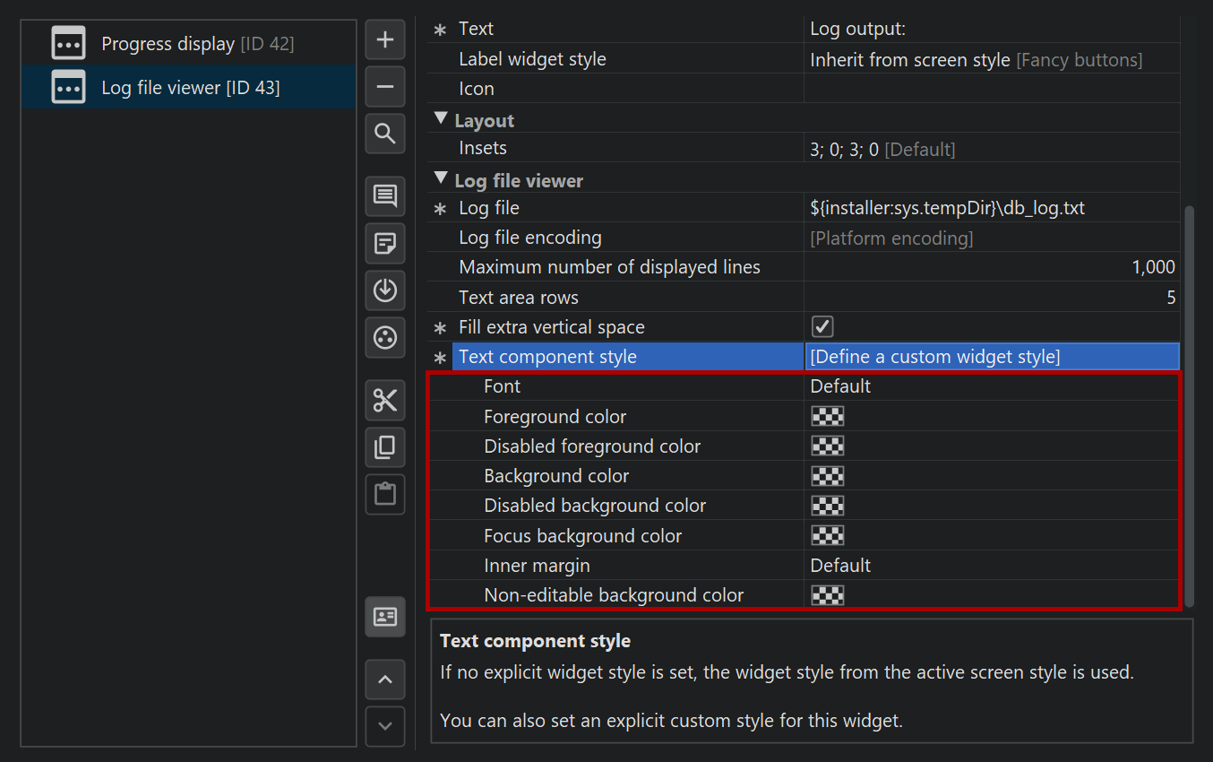 The visual appearance of widgets such as buttons, text fields and labels can be customized for installer applications, with a focus on fonts and colors. For the most part, these styles require the FlatLaf cross-platform look and feel to be selected in the Look & Feel step.