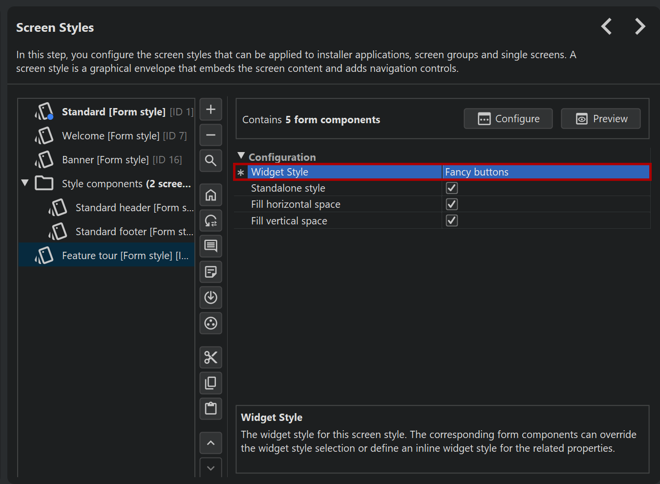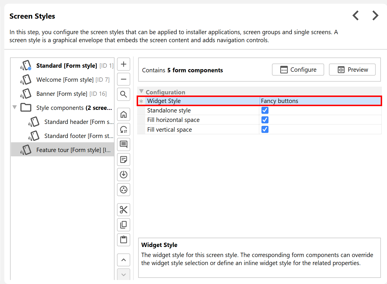 All configured widget styles are applied in the preview windows in the install4j IDE, both for screen styles and for screens. The effects of the above configuration steps are shown below.