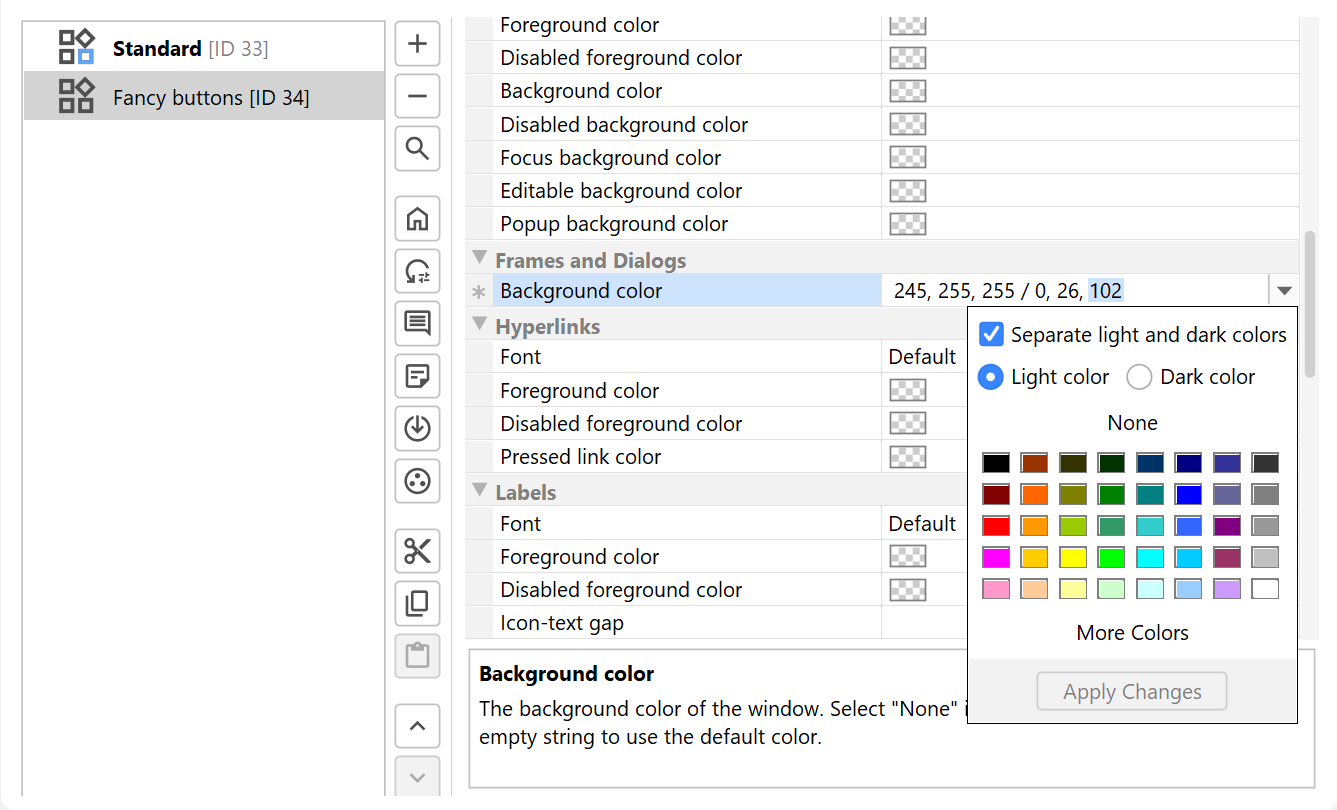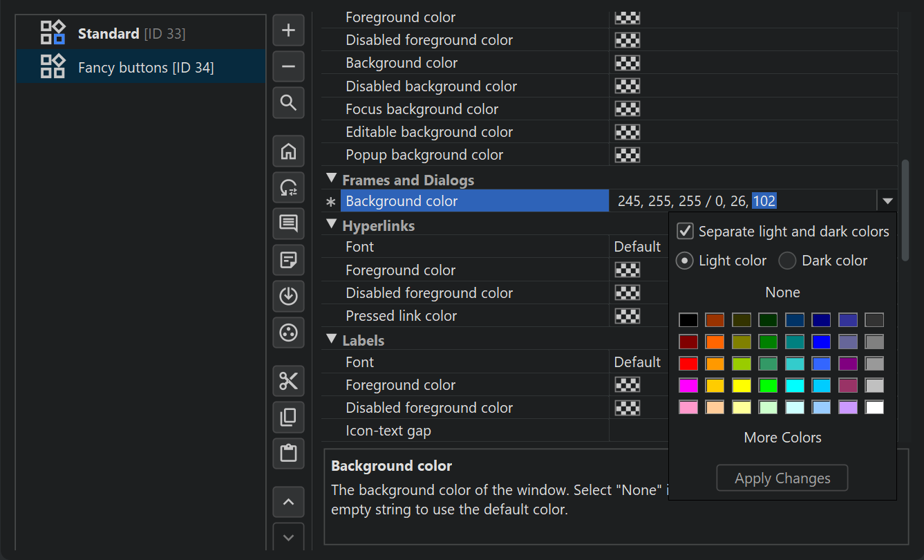 Any color that can be configured in the install4j IDE can have light mode and dark mode variants. The color chooser offers the ability