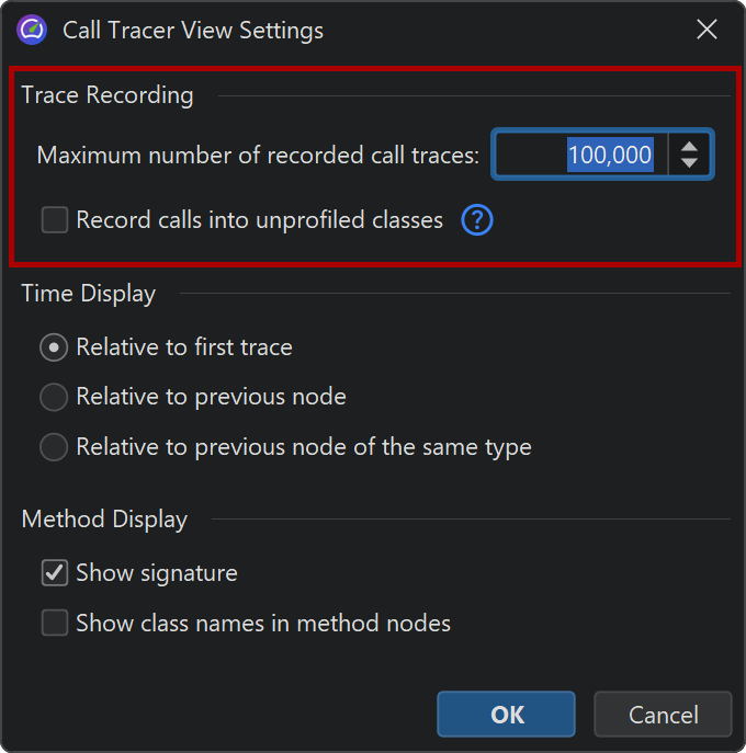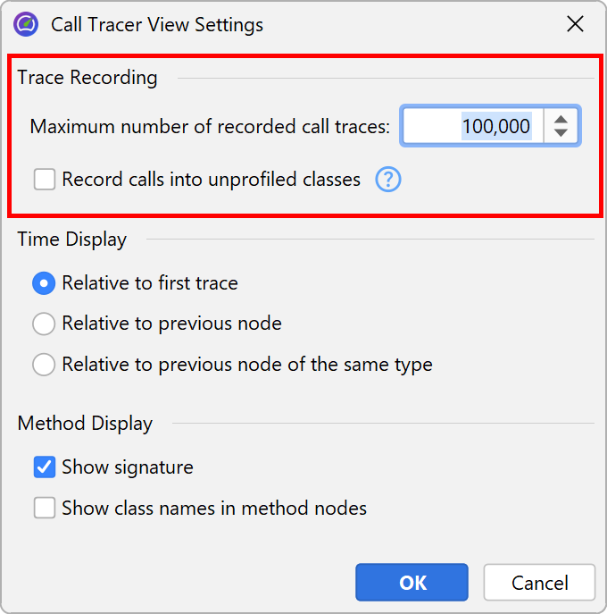 The call tracer has a separate recording action that can be activated in the call tracer view, with a trigger or with the profiling API. To avoid problems with excessive memory consumption, a cap is set on the maximum number of collected call traces. That cap is configurable in the view settings. The rate of collected traces heavily depends on your filter settings.