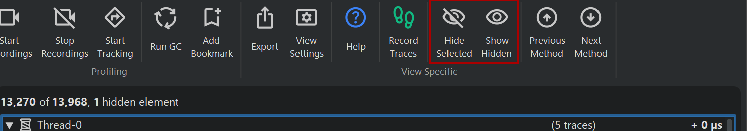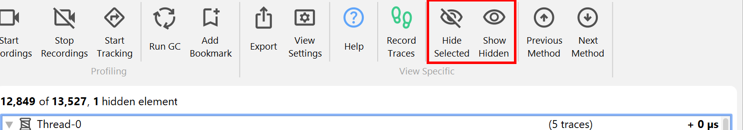 and all associated child nodes will be hidden as well. At the top of the view, you can see how many call traces