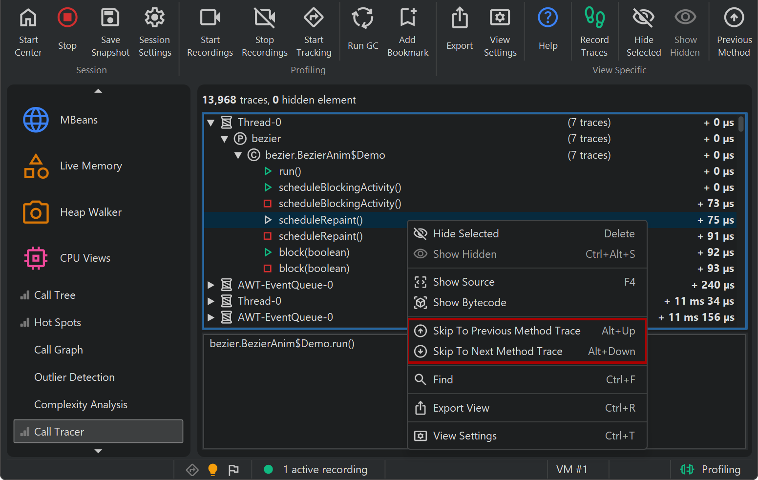 Even with appropriate filters, a huge number of traces can be collected in a very short time. To eliminate traces that are of no interest, the call tracer allows you to quickly trim the displayed data. For example, certain threads might not be relevant or traces in certain packages or classes might not be interesting. Also, recursive method invocations can occupy a lot of space and you might want to eliminate those single methods only.