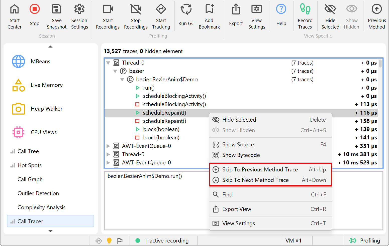 At the lowest level there are method entry and method exit nodes. Below the table with the call traces, the stack trace of the currently selected method trace is shown. If call traces into other methods have been recorded from the current method or if another thread interrupts the current method, the entry and exit nodes for that method will not be adjacent. You can navigate on the method level only by using the Previous Method and Next Method actions.