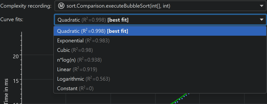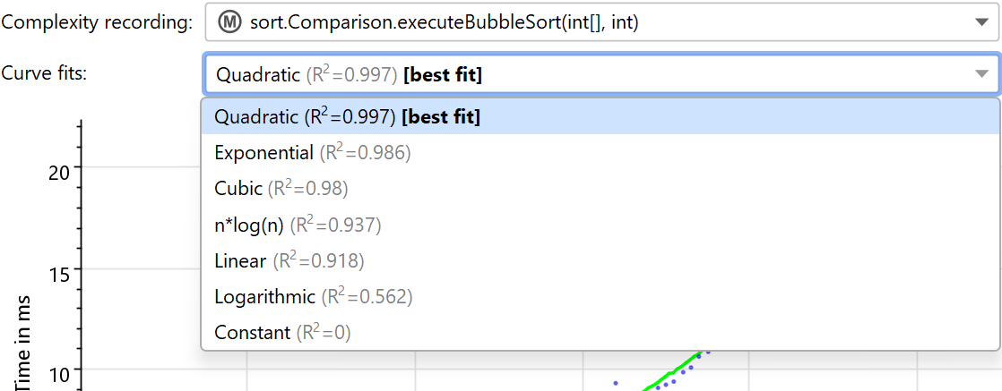 If there are at least 3 data points, a curve fit with common complexities is shown. JProfiler tries curve fits from several common complexities and initially shows you the best fit. The drop-down for the curve fits allows you to show other curve fit models as well. The R2 value embedded in the description of the curve fit shows you how good the fit is. The models in the drop-down are sorted in descending order with respect to R2, so the best model is always the first item.