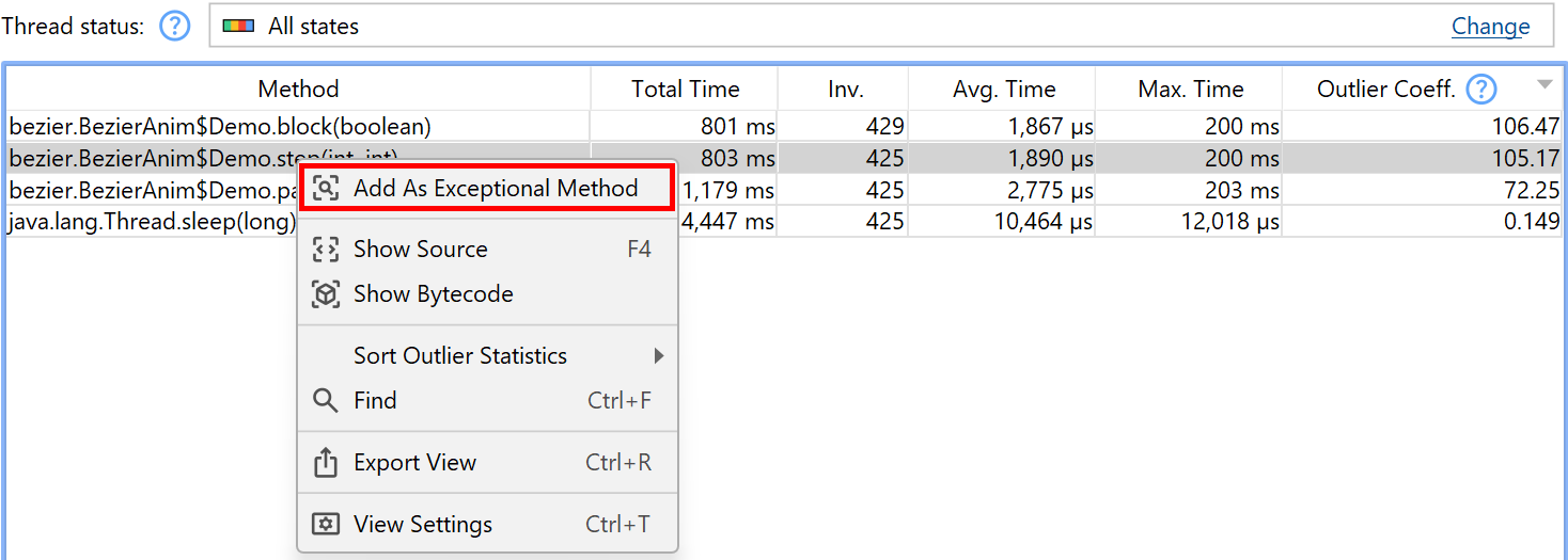 Once you have identified a method that suffers from exceptional call durations, you can add it as an exceptional method in the context menu. The same context menu action is also available in the call tree view.