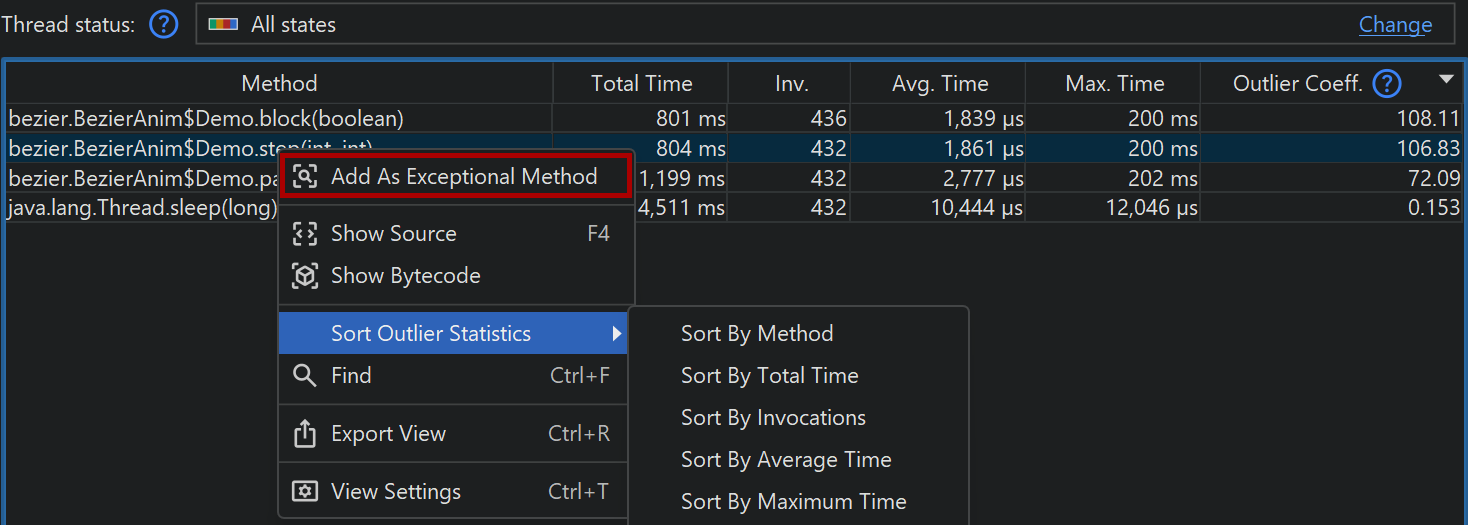 When discriminating slow method invocations, a certain thread state has to be used for the time measurement. This cannot be the thread status selection in the CPU views, because that is just a display option and not a recording option. By default, the wall clock time is used, but a different thread status can be configured in the profiling settings. The same thread state is used for the outlier detection view.