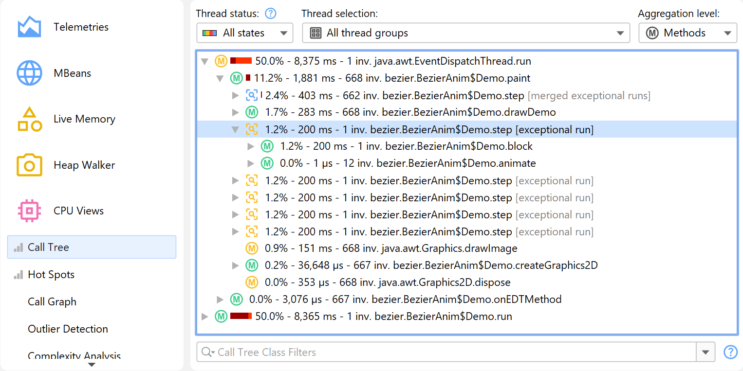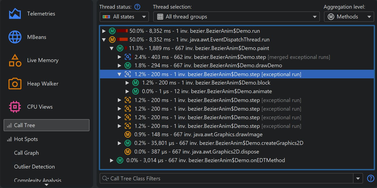 To tackle this problem, JProfiler offers the outlier detection view and the exceptional method recording feature in the call tree.