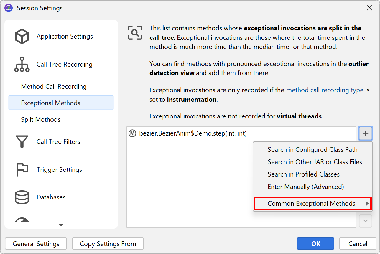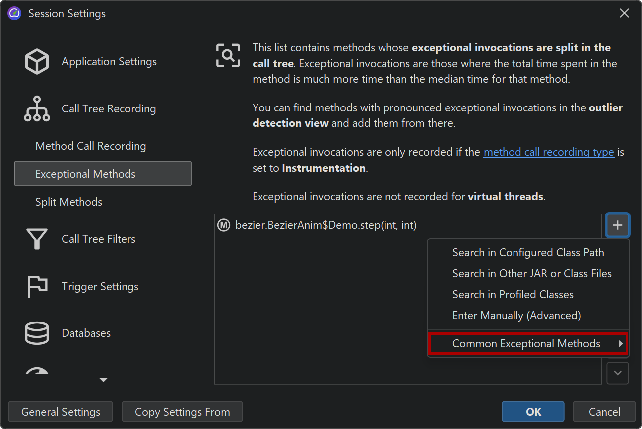 In the session settings, you can remove exceptional methods or add new ones without the context of the call tree or the outlier detection view. Also, the exceptional method configuration provides the option to add exceptional method definitions for well-known systems, like the AWT and JavaFX event dispatch mechanisms where exceptionally long-running events are a major problem.