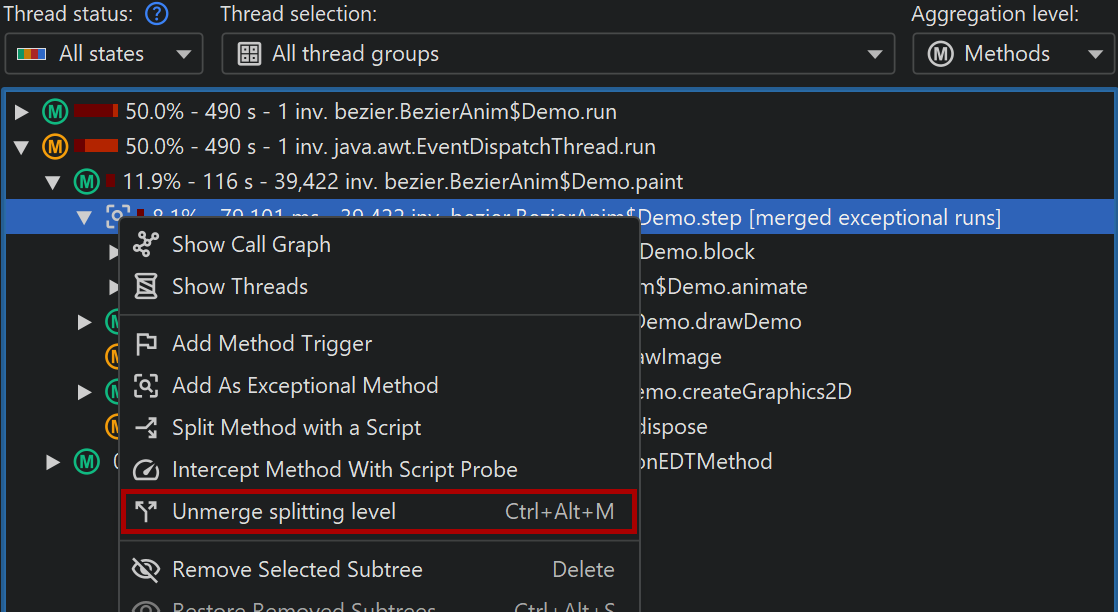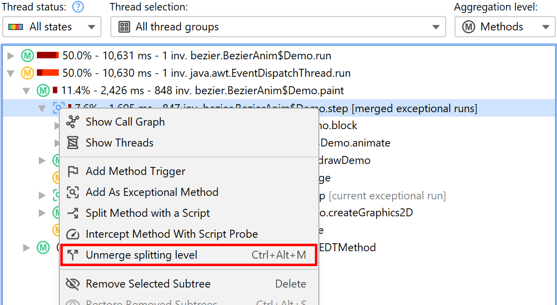 Like for call tree splitting by probes and split methods, an exceptional method node has a Merge Splitting Level action in the context menu that lets you merge and unmerge all invocations on the fly.