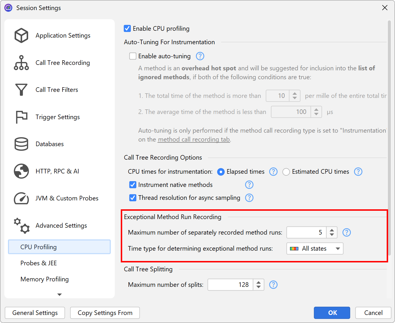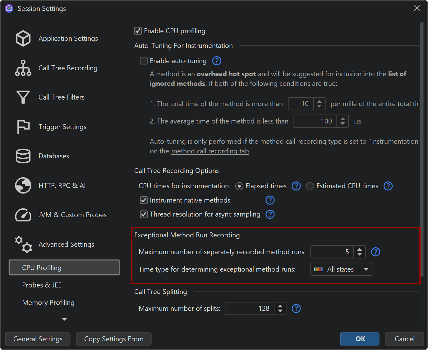 When you register a method for exceptional method recording, a few of the slowest invocations will be retained separately in the call tree. The other invocations will be merged into a single method node as usual. The number of separately retained invocations can be configured in the profiling settings. By default, it is set to 5.