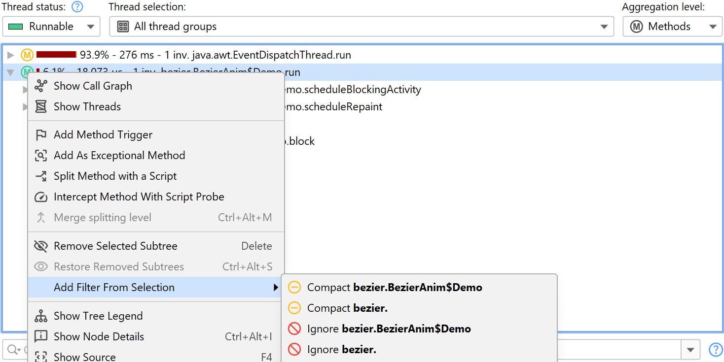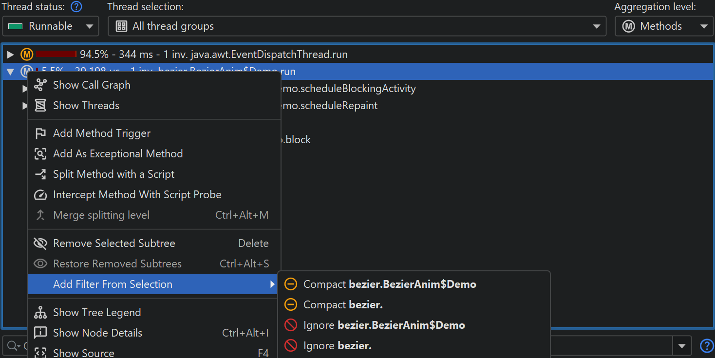 In the filter settings, you can also ignore entire classes or packages by setting the type of the filter entry to "Ignored". The Add Filter From Selection menu contains actions that depend on the selected node and suggest ignoring the class or packages up to the top-level package. Depending on whether the selected node is compact-profiled or profiled, you also see actions for changing the filter to the opposite type.