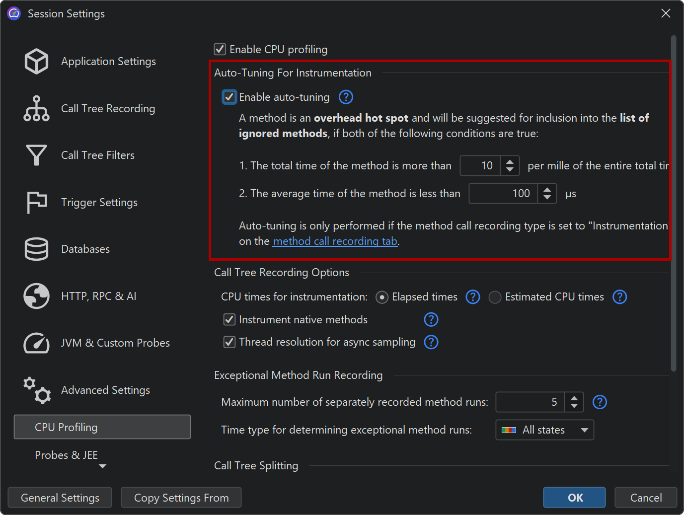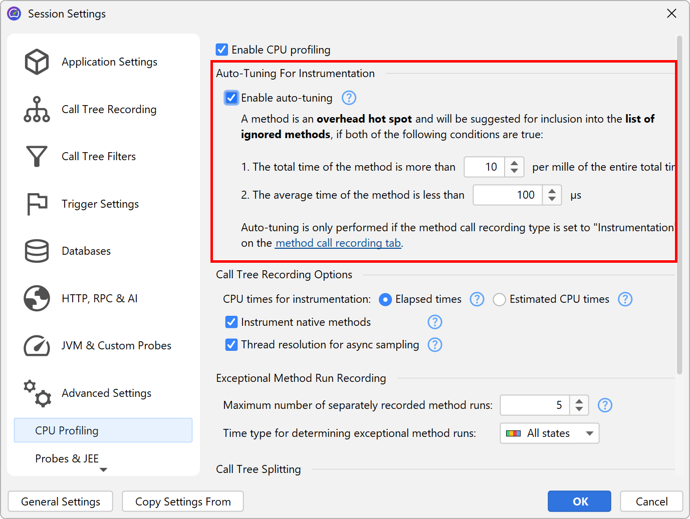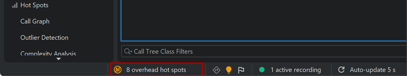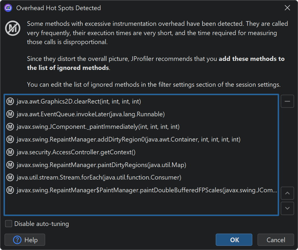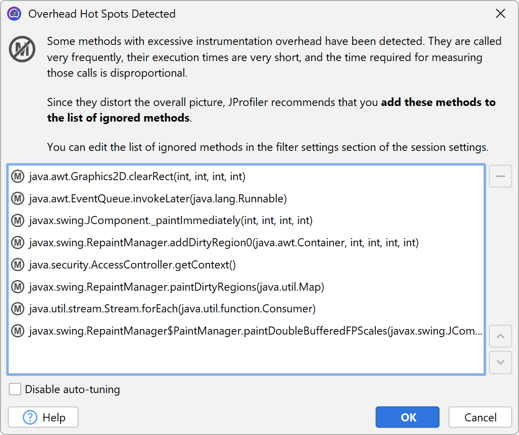 In case you don't want to see any messages about auto-tuning, you can disable it in the profiling settings. Also, you can configure the criteria for determining an overhead hot spot. A method is considered an overhead hot spot if both of the following conditions are met: