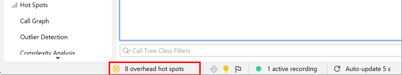 To alleviate the problem with instrumentation, JProfiler has a mechanism called auto-tuning. From time to time, the profiling agent checks for methods with high instrumentation overhead and transmits them to the JProfiler GUI. In the status bar, an entry alerting to the presence of overhead hot spots will be shown.