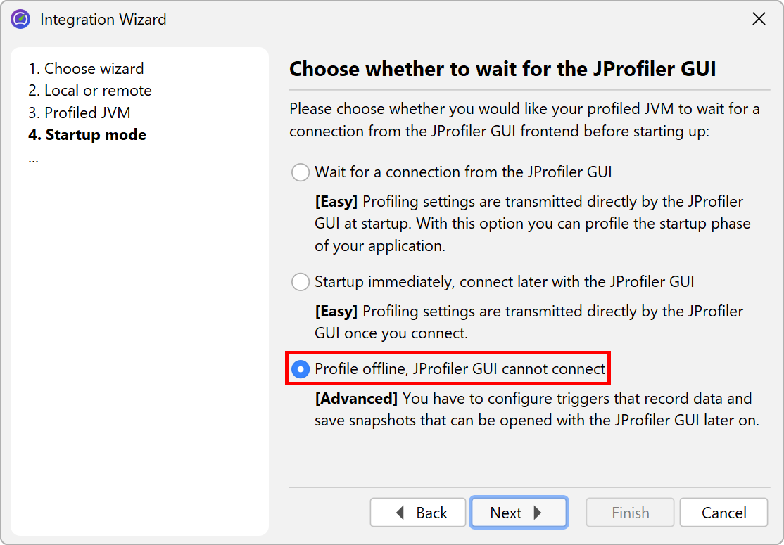 When profiling an application server with the integration wizards, there is always a start script or config file that is being modified so that the VM parameters for profiling are inserted into the Java invocation. All integration wizards have a "Profile offline" option on the "Startup" step in order to configure the application server for offline profiling instead of interactive profiling.